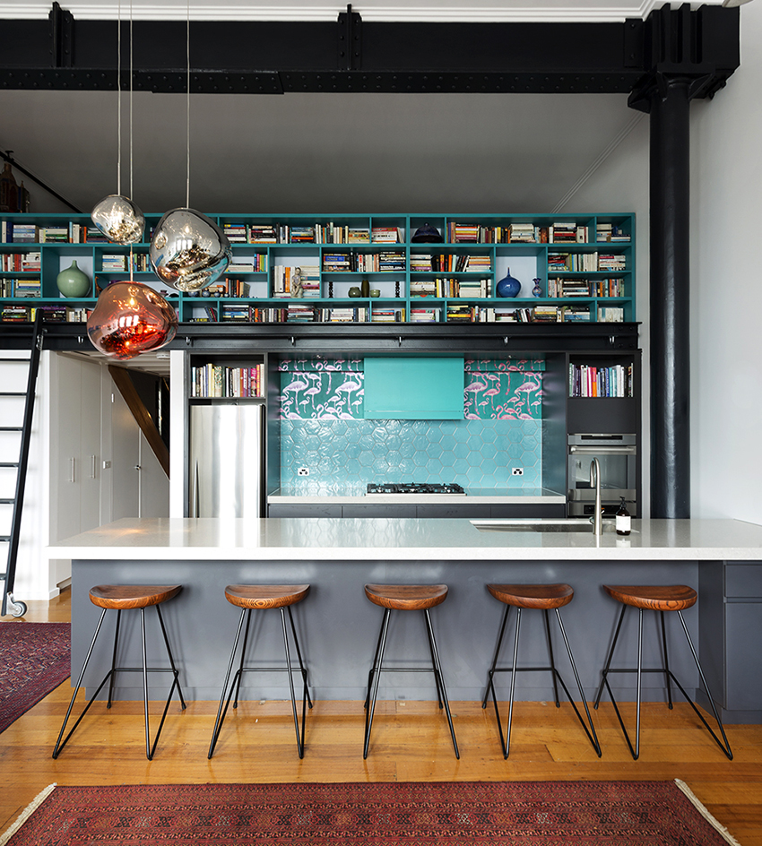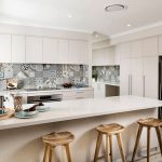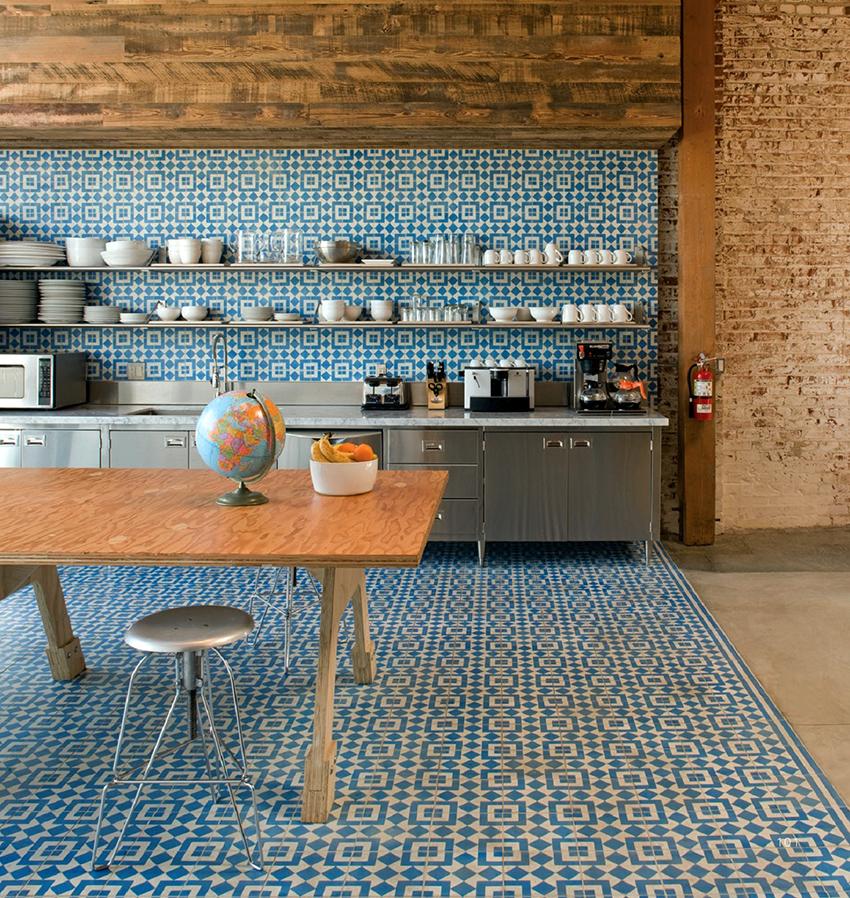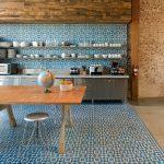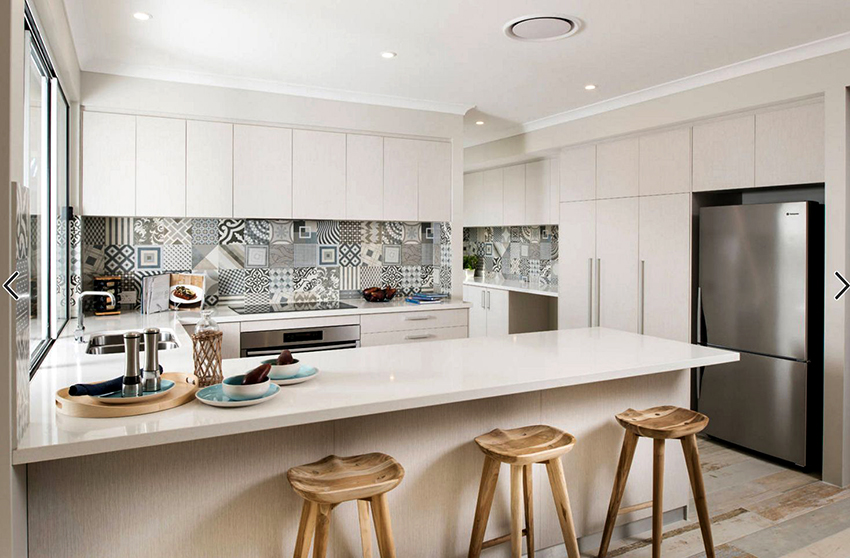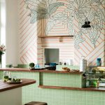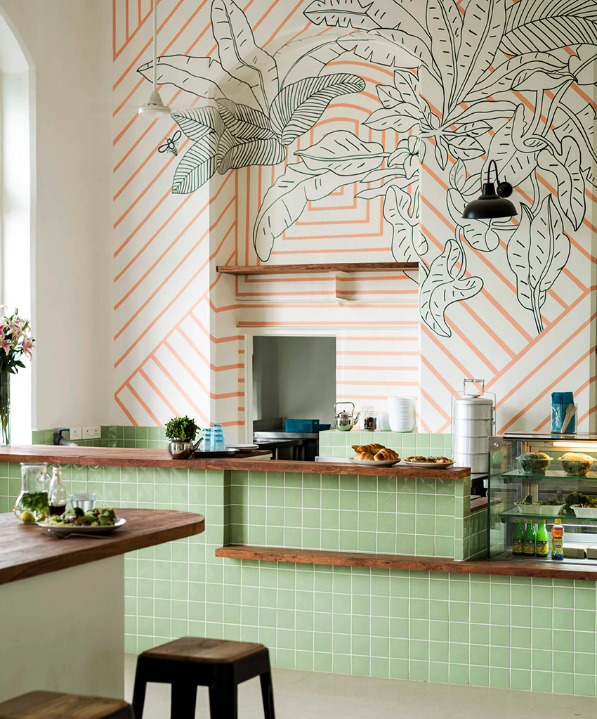 - Bentuk biasa secara geometri di dinding dapur, seperti kotak, garis-garis yang bersilang, mewujudkan kesan ruang yang berterusan.