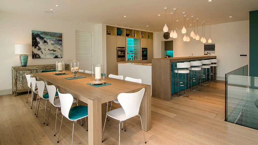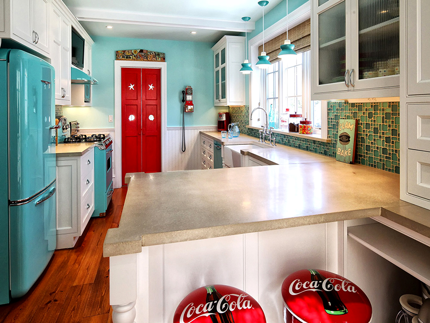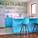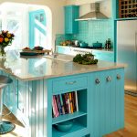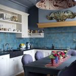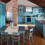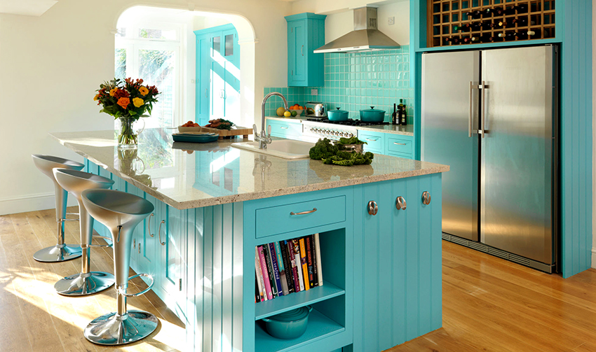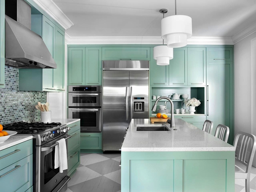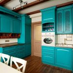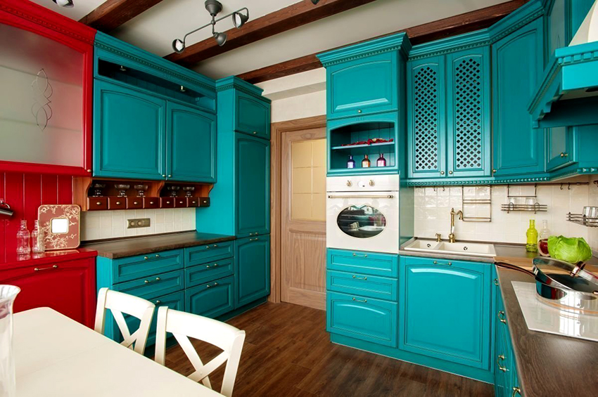 Sekiranya anda melihat foto-foto dapur pirus, anda boleh menemui banyak warna di sini - dari hijau laut dalam hingga biru pucat. Motif laut seperti itu dianggap santai. Memilih nada biru yang lebih sejuk akan menjadikan ruangan kelihatan lebih sejuk, dan memilih warna pirus yang lebih kuat akan menjadikan dapur terasa lebih panas. Pilihan reka bentuk pirus paling sering digunakan ketika menghias dapur dengan gaya berikut: