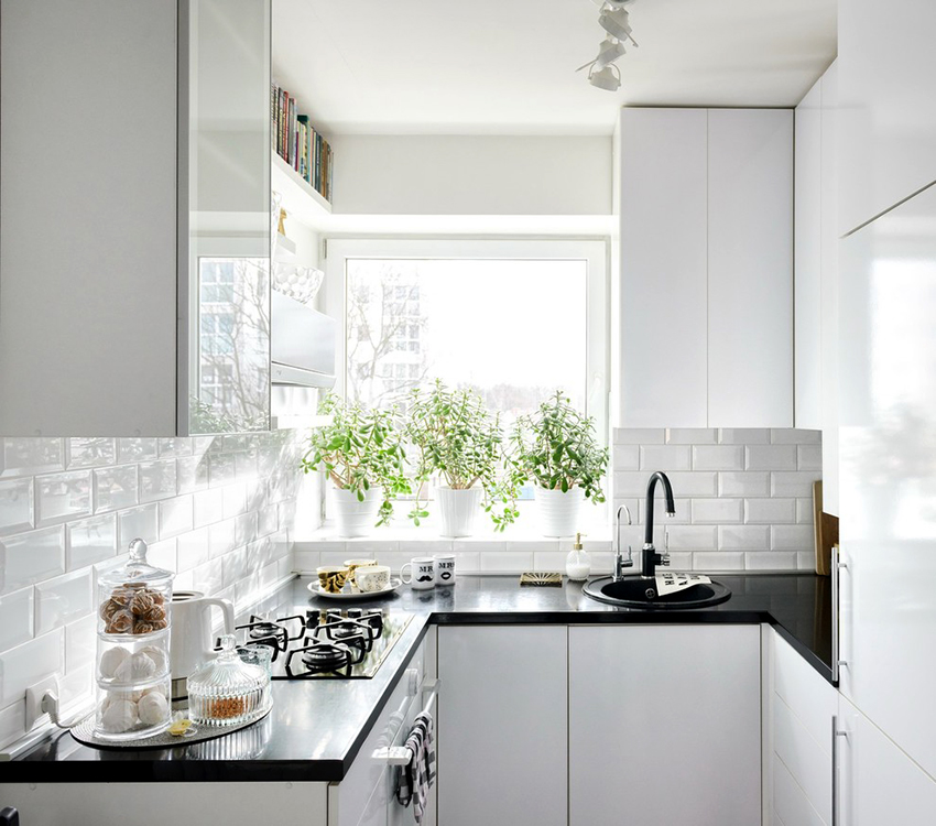 Dalam keadaan di mana perabot di dapur disusun dalam lingkaran, permukaan antara lapisan kabinet, serta apron dapur, disarankan untuk dilakukan dengan warna terang untuk mencegah penciptaan ruang tertutup.Pembukaan tingkap dapat diperluas secara visual jika permukaan mendatar di sekitarnya dihiasi dengan warna putih. Oleh itu, bilik boleh dibuat lebih terang.