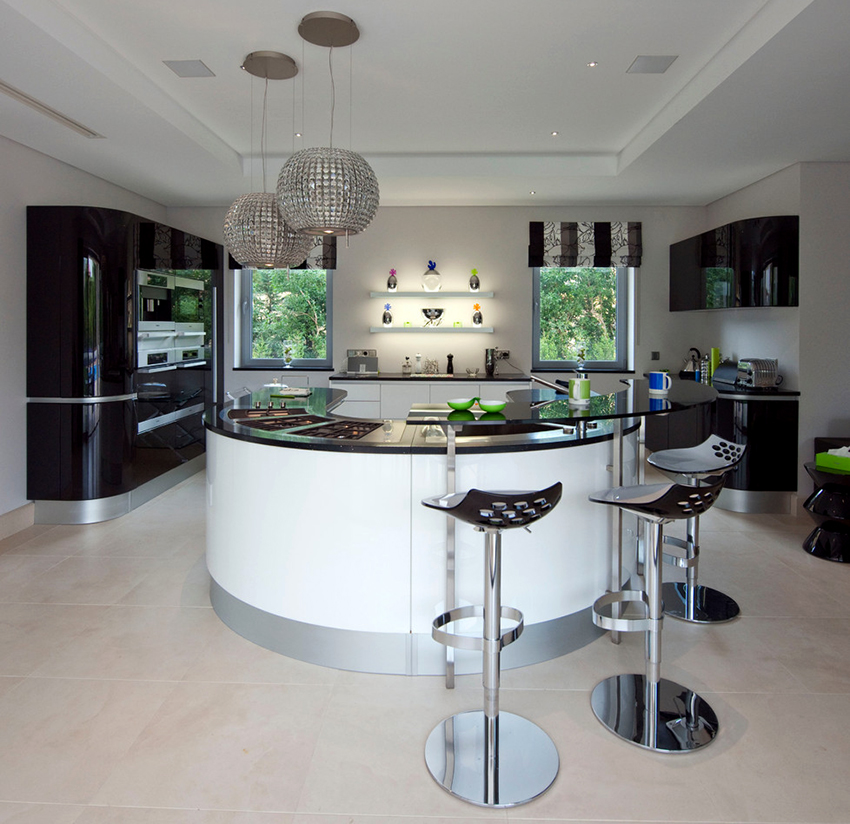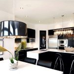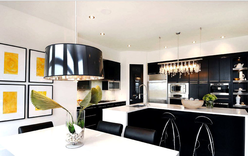 Gabungan hitam dan putih telah lama menjadi tradisional, tetapi jika anda ingin menjadikan hitam sebagai warna utama, maka reka bentuk dapur seperti itu menjadi lebih rumit. Dalam kes ini, terdapat risiko untuk mewujudkan dalaman yang terlalu suram dan gelap. Sekiranya anda melihat foto dapur, warna paling sering digunakan dalam nisbah 60 hingga 40%, dan kebanyakannya diberi warna putih.