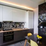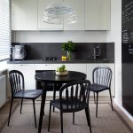 Nasihat berguna! Kaedah terbaik untuk merancang dapur hitam dan putih ini dianggap sebagai pilihan ketika dinding dan siling dibuat dengan warna terang, dan lantai berwarna gelap. Lebih baik membuat fasad atas terang, dan yang lebih rendah boleh dibiarkan berwarna hitam. Meja kerja boleh ringan, dan apron dapur boleh berwarna hitam putih.