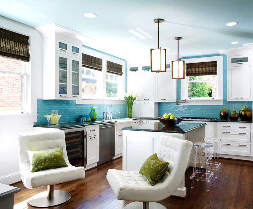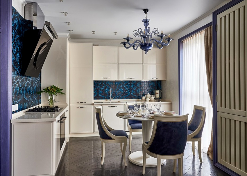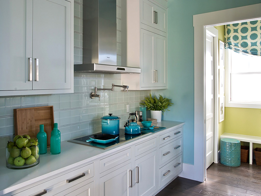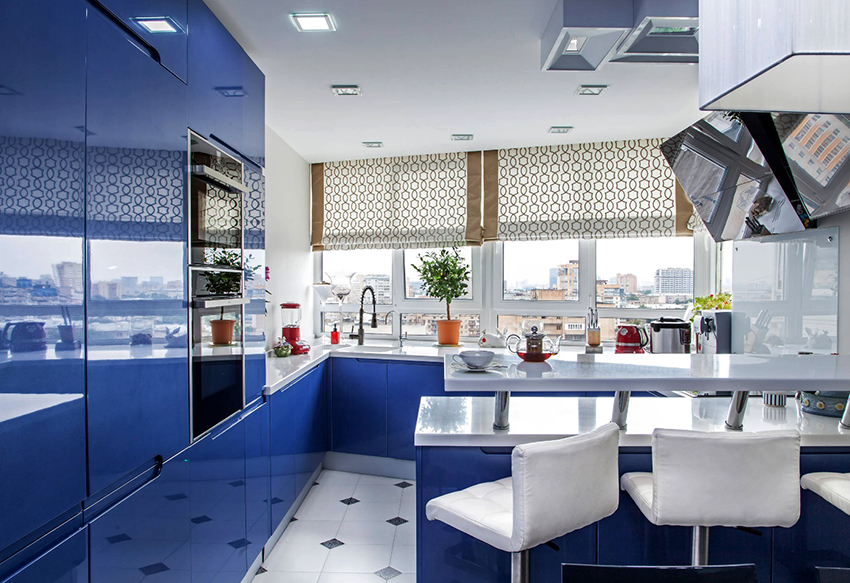 Nada sejuk yang ringan secara visual meningkatkan ketinggian dinding. Oleh itu, jika ruangan tidak tinggi, disarankan untuk membuat dapur berwarna biru, sementara disarankan untuk membiarkan dindingnya kosong.