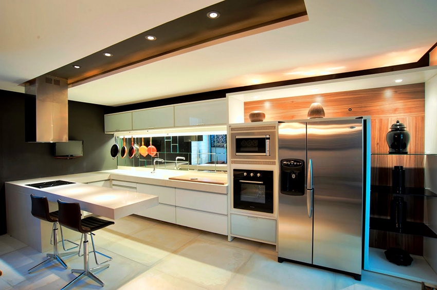 - Teknologi tinggi. Trend ini lebih memilih bahagian dalaman dapur monokrom. Selalunya, dapur dibuat dengan warna kelabu, perak atau putih. Di pedalaman, penting untuk menggunakan keluli tahan karat warna - permukaan meja keluli akan kelihatan sangat bagus.