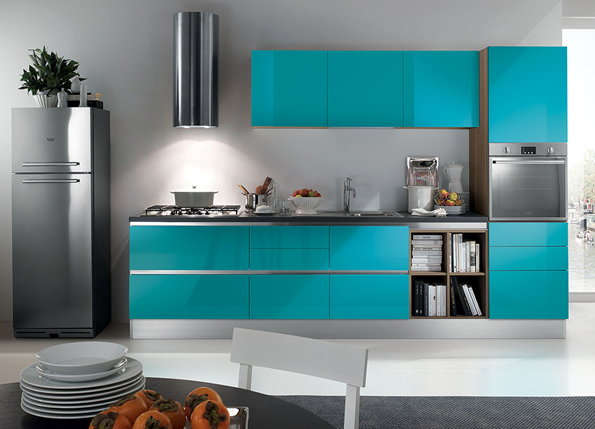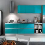 - Minimalisme dan berteknologi tinggi. Sebelum memilih warna untuk set dapur yang sesuai dengan pedalaman berteknologi tinggi pirus, anda perlu memahami bahawa fasad berkilat harus lebih disukai.