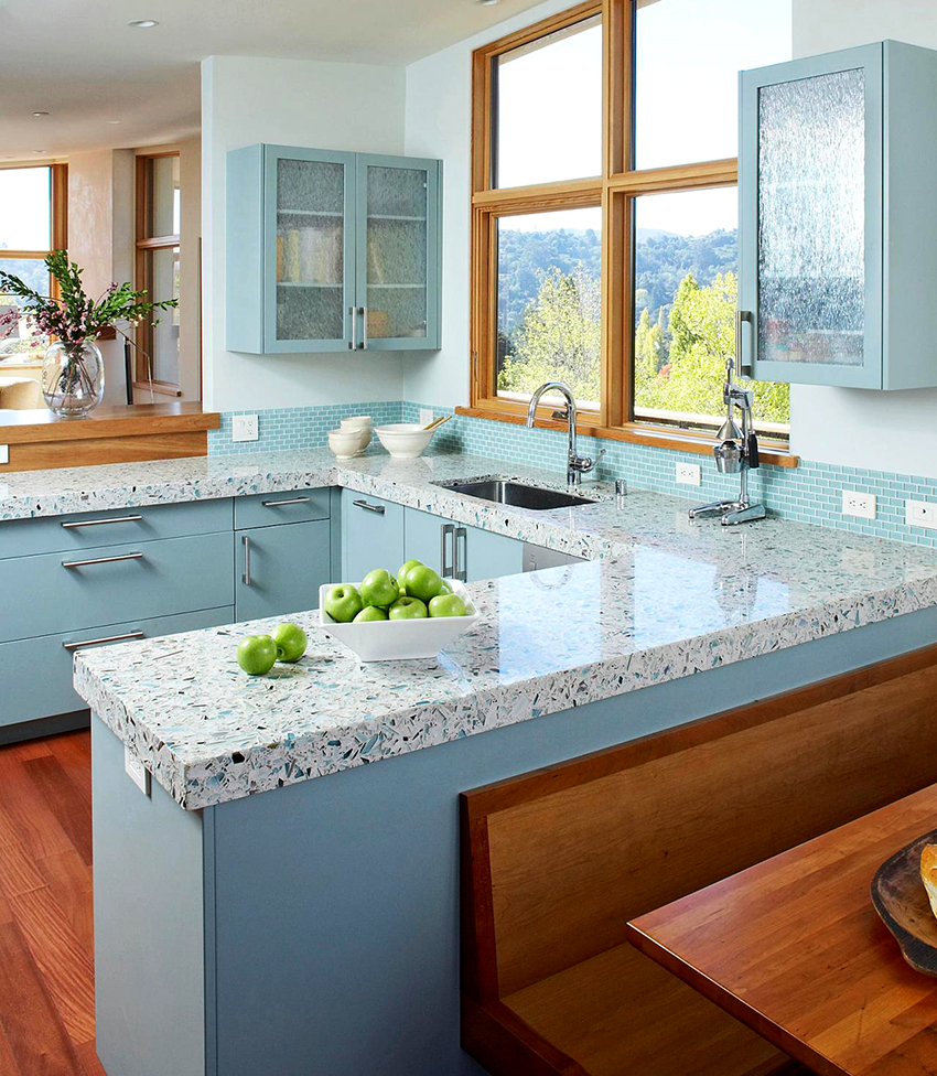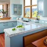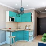 Pilihan yang baik adalah dapur putih dan pirus, ketika set biru kelihatan mewah dengan latar belakang dinding putih salji. Penyelesaian ini sangat sesuai untuk mengatur dapur kecil. Kombinasi standard lain adalah gabungan kelabu dan pirus. Tandem ini sangat relevan untuk dapur moden, di mana terdapat sebilangan besar bahagian krom. Pilihan terbaik untuk reka bentuk dalaman moden adalah penggunaan perabot kelabu grafit, yang disetel dengan latar belakang warna biru muda. Pada masa yang sama, siling dan tirai dibuat dengan nada biru pucat, dan putih digunakan untuk hiasan dinding.