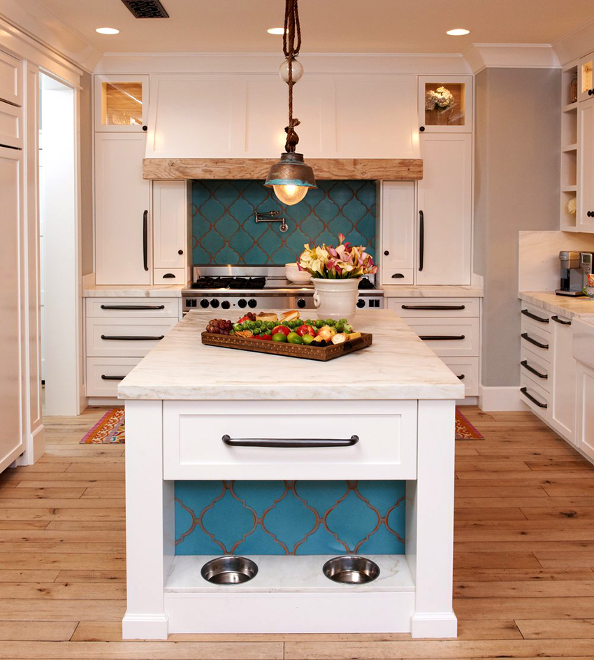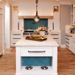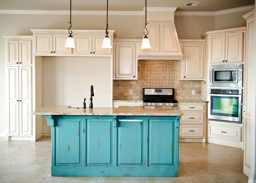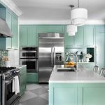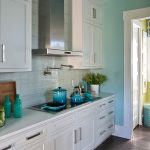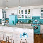 Sekiranya anda ingin menjadikan dapur pirus lebih halus, gunakan warna mutiara dan mutiara yang sesuai untuk menghias siling, langsir, apron atau meja. Dinding boleh dibuat dengan warna kuning air netral dan perabot dengan warna biru laut. Gabungan set dapur beige dengan apron pirus juga kelihatan baik.