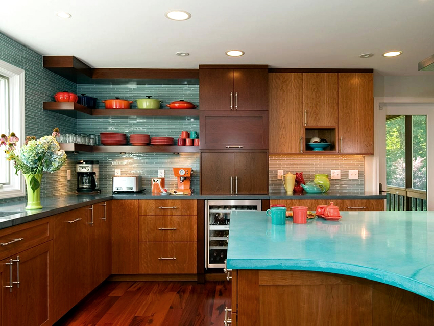 - Sekiranya dapur besar dan tidak perlu menjimatkan ruang, disarankan untuk memilih warna tepu dan terang.