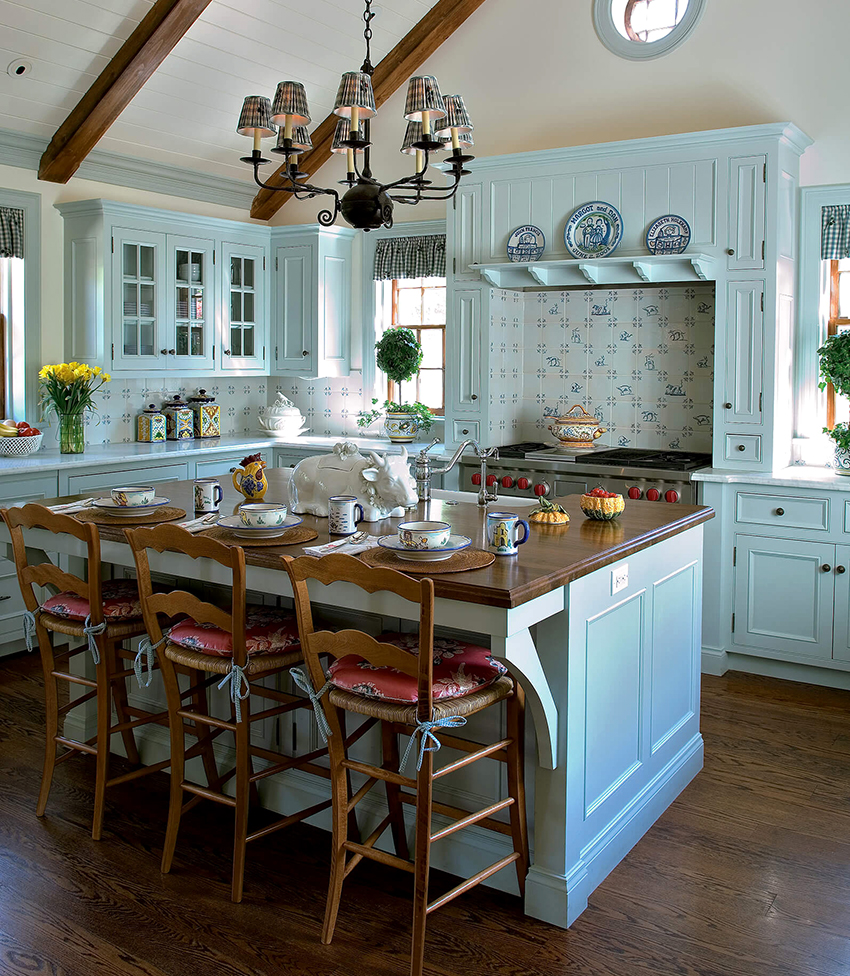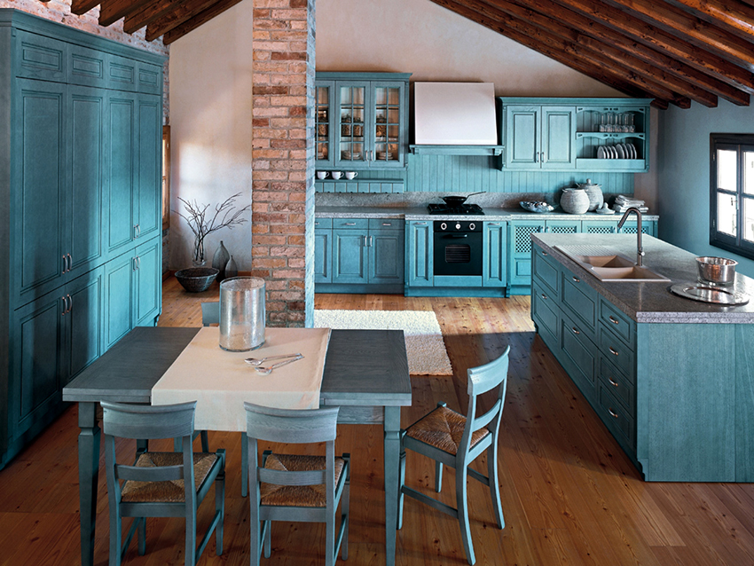 - Negara. Dalam kes ini, warna biru terang lebih disarankan, yang digunakan untuk menyelesaikan apron, serta permukaan lainnya. Adalah baik untuk menggabungkan warna putih dan hijau dan bahkan warna hitam dan putih di bahagian dalam seperti itu.