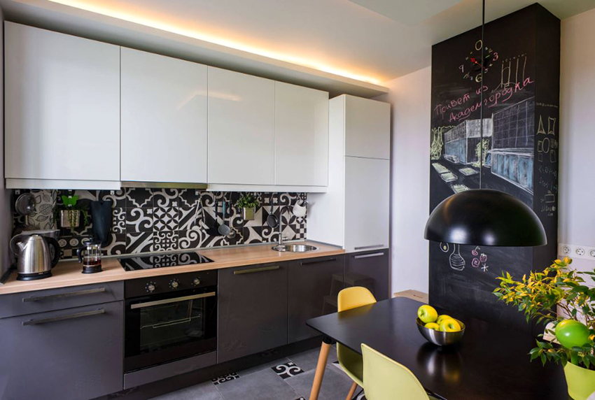 Persekitaran yang monoton dapat menjerumuskan seseorang ke dalam kemurungan dan menyebabkan suasana hati yang tidak apik. Oleh itu, lebih baik mencairkan warna utama dapur dengan teduhan tambahan. Contohnya, anda boleh meletakkan lantai seperti papan catur. Untuk menaikkan suasana di tempat yang mencolok, perlu memasang elemen aksen terang yang memeriahkan ruangan.