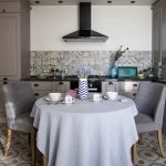 - Backsplash dan worktop dibuat dalam warna yang bertentangan dengan warna perabot dapur dan kumpulan makan. Dengan bantuan perincian yang berbeza, anda boleh meletakkan aksen di dalam bilik dengan betul.