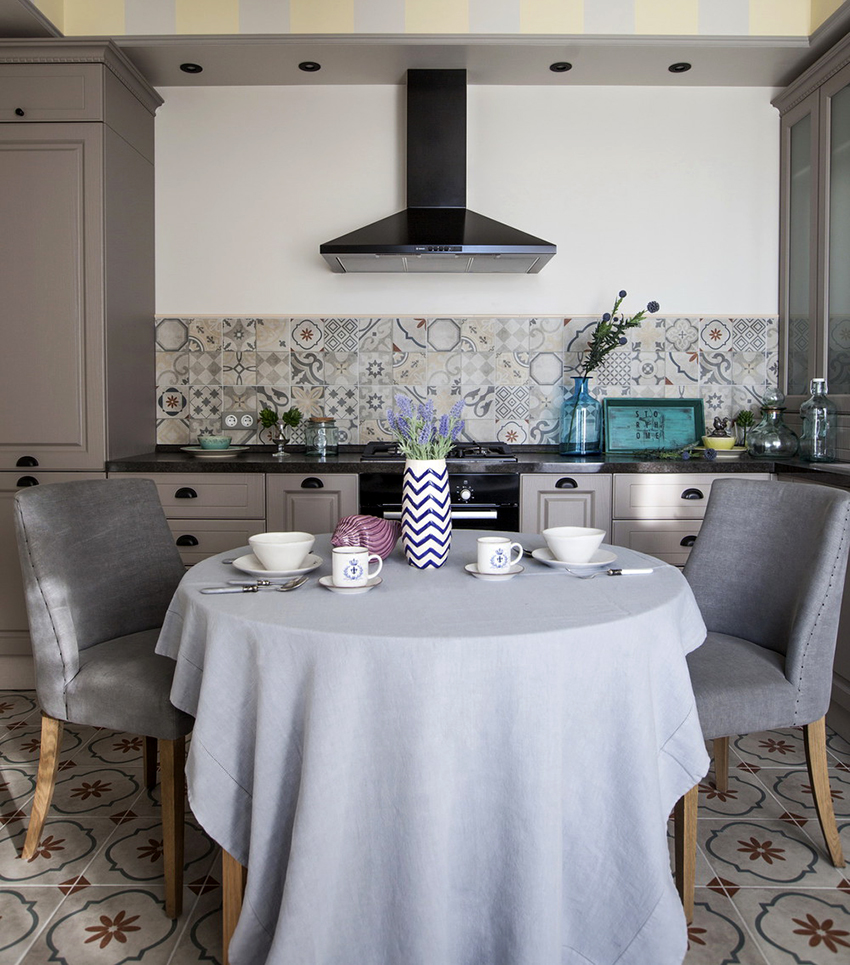 Kelabu | Warna kelabu di bahagian dalam dapur itu sendiri akan menjadikan ruang membosankan, sehingga dicairkan dengan nada merah jambu, merah, biru dan ungu. |