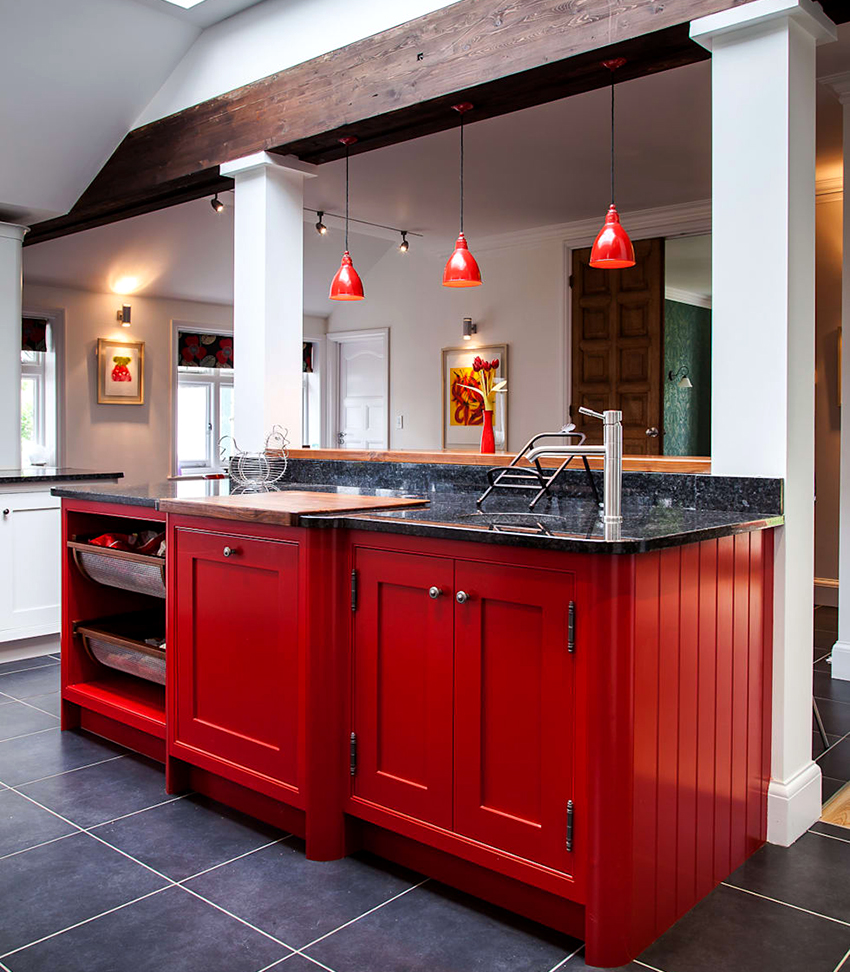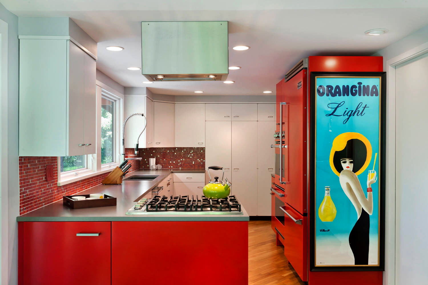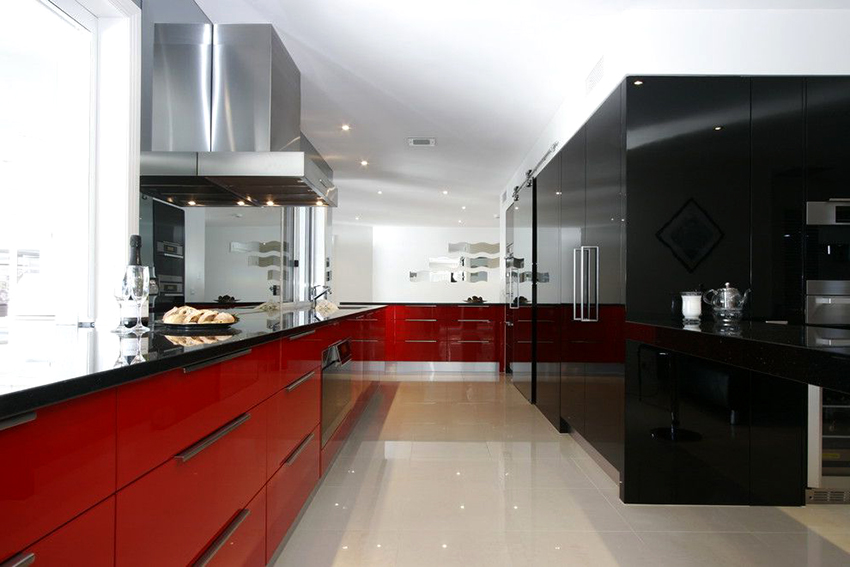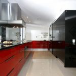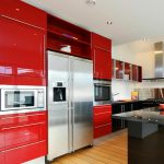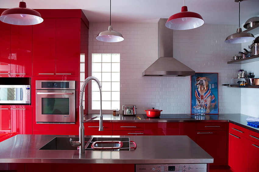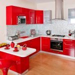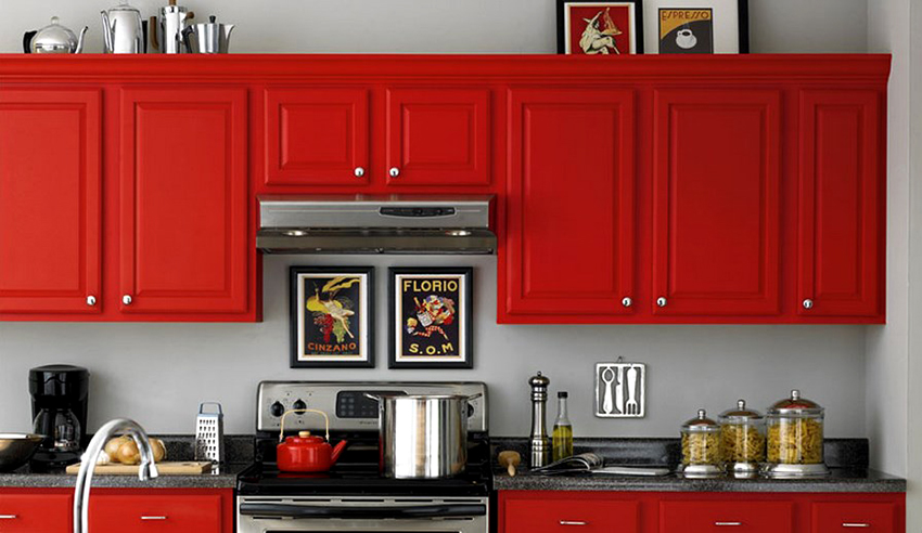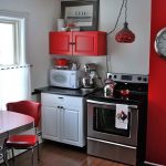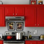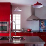 Penting! Pereka mengesyorkan menggunakan warna merah hanya untuk menghias dapur besar, kerana ruang itu secara visual menyempitkan dan sangat memenatkan di kawasan yang sempit.