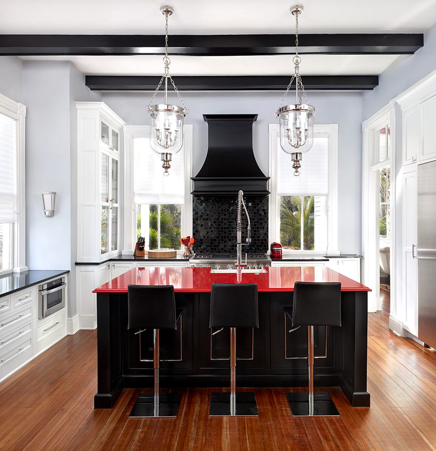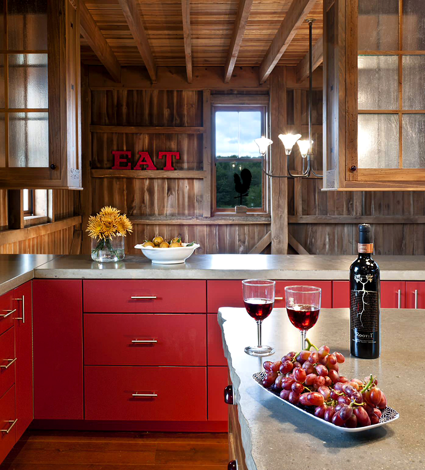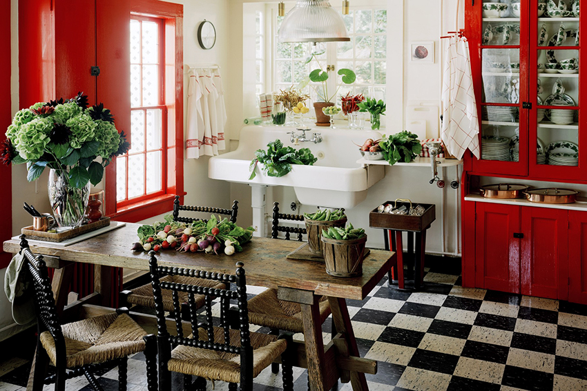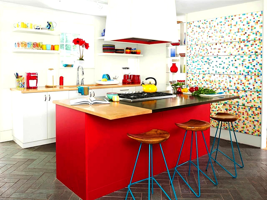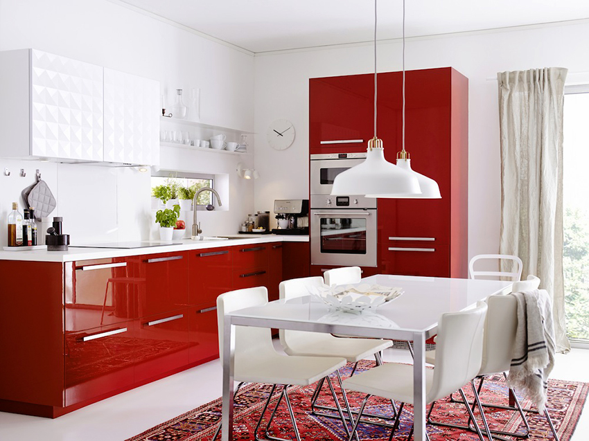 Warna merah disyorkan untuk menghias dapur dalam gaya retro, Provence, fusion. Sekiranya digunakan dengan betul, warna merah juga sesuai untuk membuat dalaman klasik. Fleksibiliti warna ini terletak pada hakikat bahawa ia mudah digabungkan dengan warna lain dan pelbagai corak geometri.
