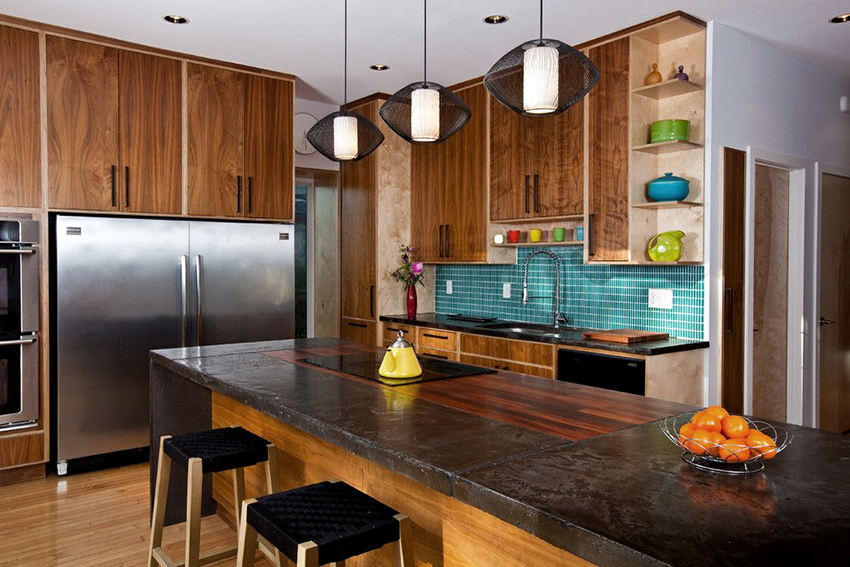 Foto countertop di Internet adalah sumber idea yang tidak habis-habisnya untuk mewujudkan bahagian dalam dapur yang selesa. Anda boleh menentukan sendiri bentuk dan bahan yang digabungkan dengan baik.