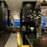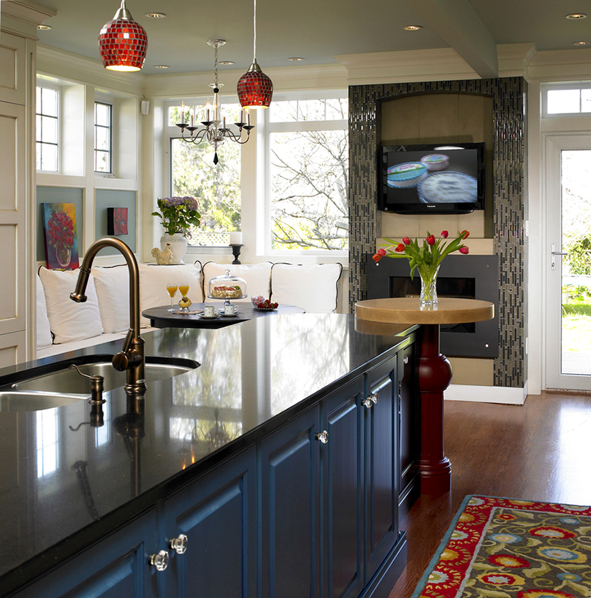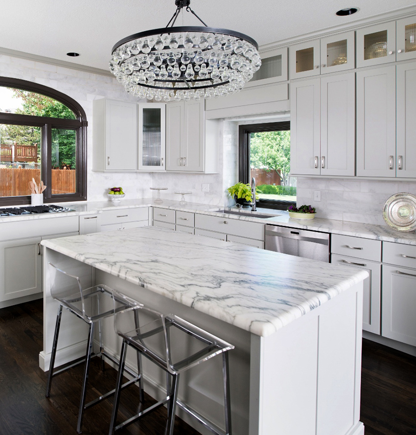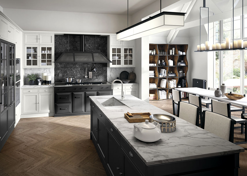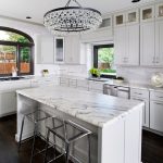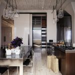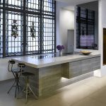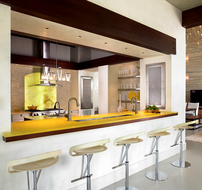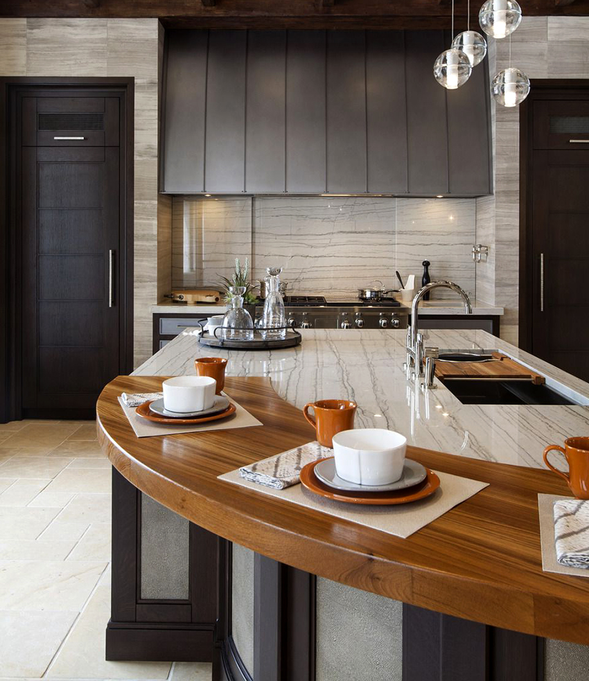 Elemen dapur seperti itu tidak sesuai di sebelah perabot yang diperbuat daripada papan serpai atau plastik pilihan. Sekiranya meja marmar dipilih untuk dapur, maka permukaan meja makan harus dibuat dari bahan yang serupa atau dari yang lain dipilih dengan mahir oleh pereka. Batu ini mesti berada dalam "bingkai perabot" yang mahal.