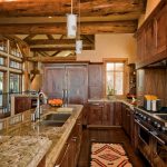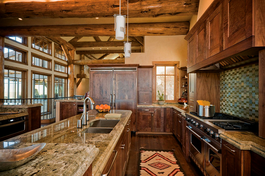 Bahagian depan kayu berat melengkapkan permukaan batu semula jadi atau batu buatan yang tidak tebal. Untuk cahaya, perabot pastel, countertop batu hijau atau coklat lebih sesuai. Marmer putih kelihatan hebat dari perabot yang lebih gelap, tetapi selalu berwarna. Warna batu yang lebih gelap sesuai dengan perabot dan fasad ringan, di mana struktur semula jadi kayu dipelihara.