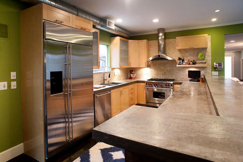 Batu semula jadi atau tiruan paling sering digunakan sebagai bahan untuk countertop blok. Agak mahal untuk melaksanakan elemen perabot dapur untuk membuat pesanan. Pengilang moden untuk mengatur pilihan dapur monolitik apabila permukaan kerja dan backsplash diperbuat daripada bahan yang sama, misalnya: meja kerja berlamina dan penutup dinding dari piring dengan kualiti yang sama, atau meja dan dinding dilapisi dengan jubin yang sama.