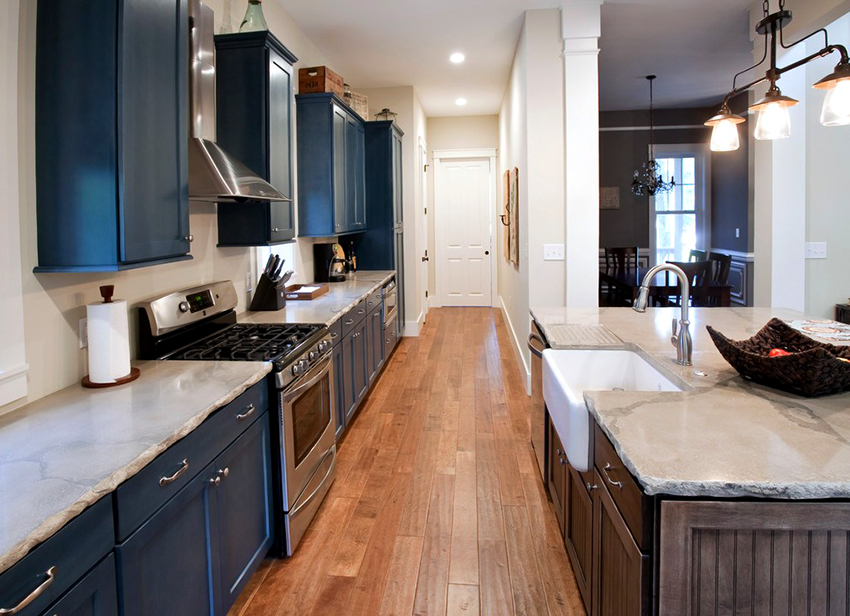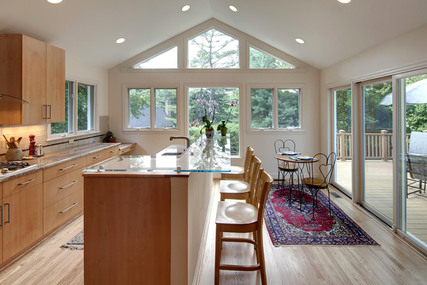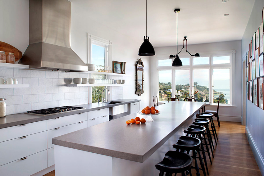 - Meja kerja batu semula jadi lebih sesuai untuk dapur besar. Permukaan itu sendiri mesti mempunyai panjang sekurang-kurangnya 2.5 m, atau di dapur juga mesti ada permukaan mendatar yang terbuat dari bahan yang sama.