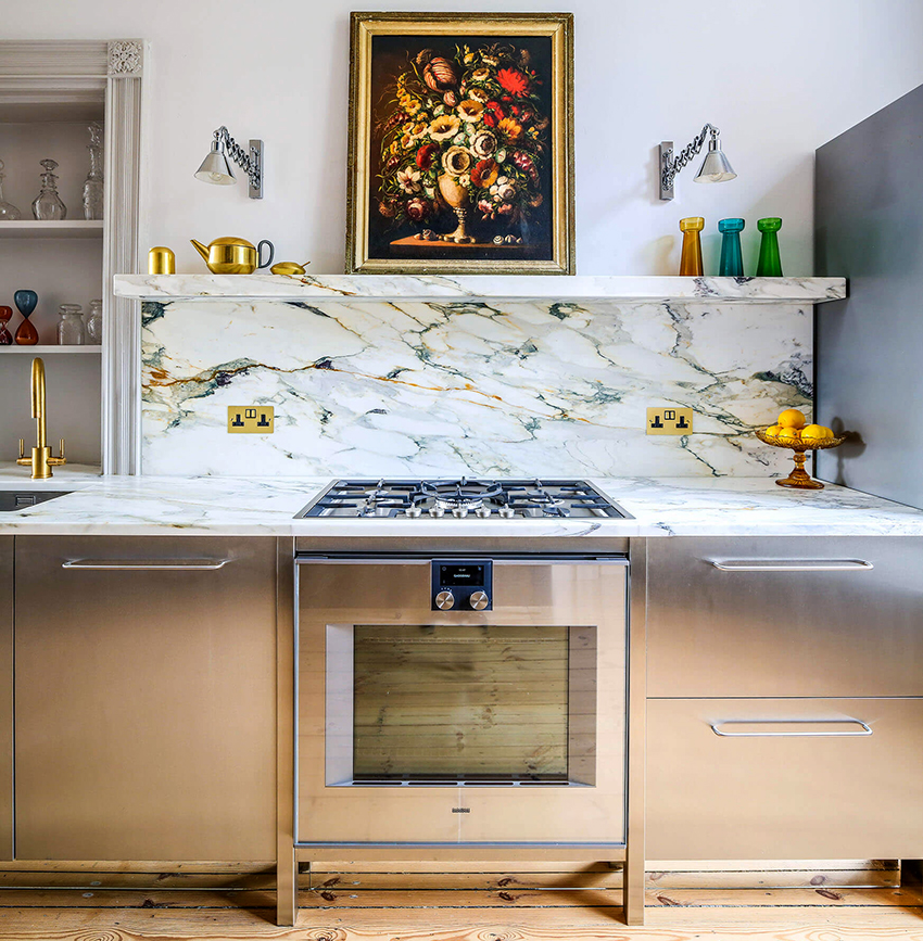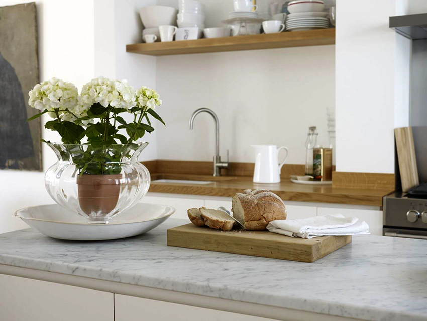 Marmer tidak bertolak ansur dengan produk batu lain. Lebih baik memasang kompor kaca seramik, sink matte, yang mempunyai warna meja yang tenang dan tidak kontras.