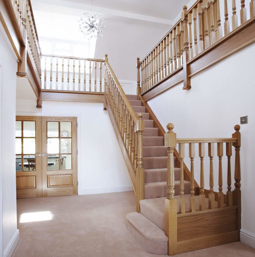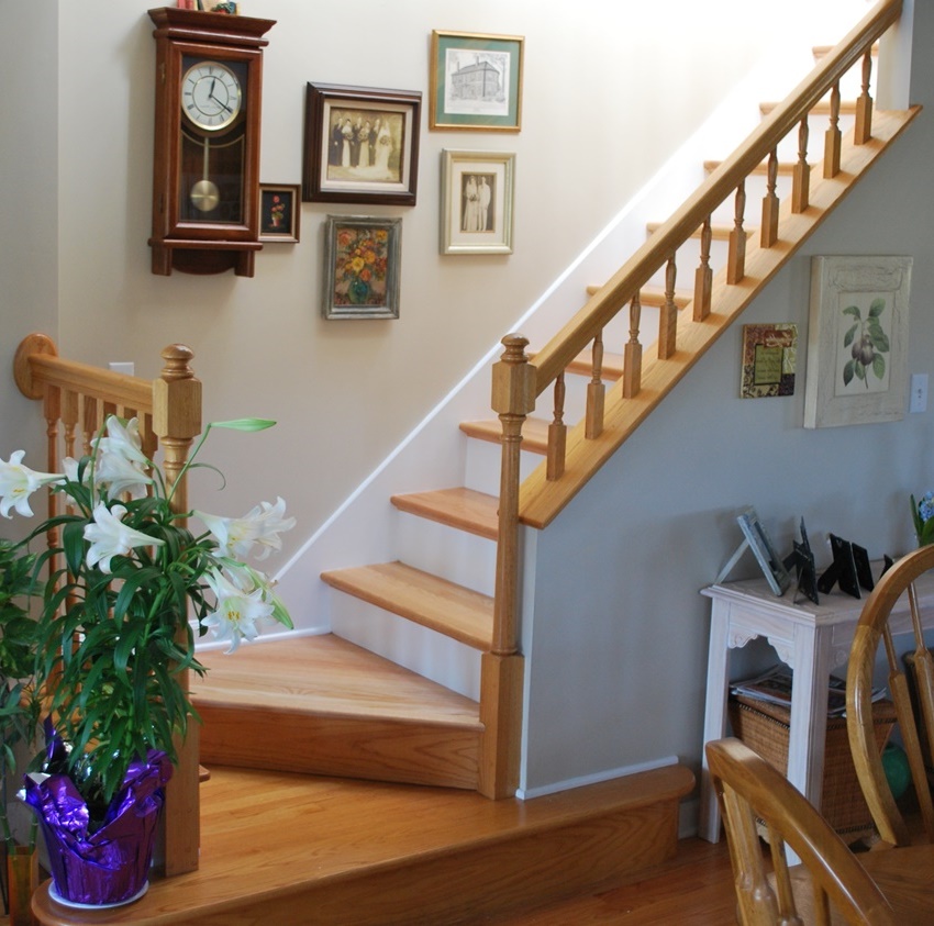 Untuk menghias tangga dengan gaya klasik, anda harus memilih bentuk sederhana dan warna semula jadi.