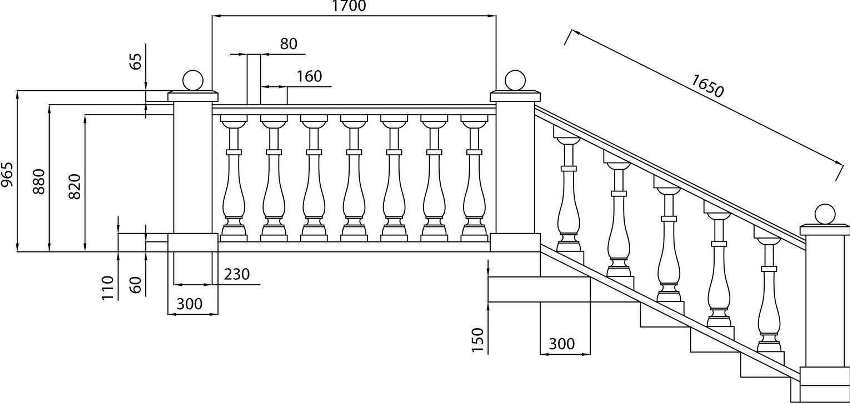 Pada peringkat reka bentuk, sangat penting untuk mengukur ketinggian pagar. Pakar mengesyorkan agar parameter ini bervariasi dari 0,7 hingga 1 m. Untuk tidak salah perhitungan dengan jumlah rak, anda perlu mengira jarak masa depan di antara mereka.Maka akan lebih mudah untuk memasang balusters di tangga, kerana semua dimensi akan diperhatikan dengan ketat.