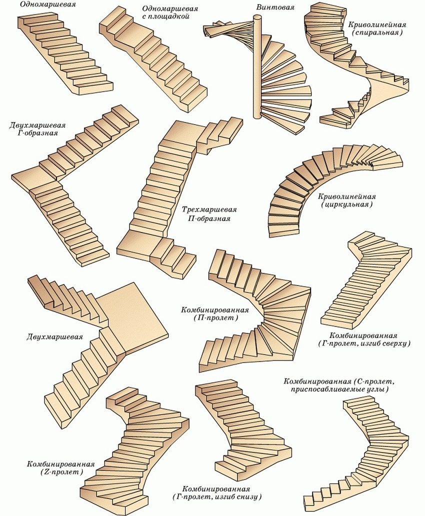 Tangga yang dipasang di dalam rumah atau apartmen adalah sederhana - ia merangkumi struktur lurus, dan tangga dengan platform. Tangga di rumahyang mengandungi beberapa penerbangan adalah kanan (belok mengikut arah jam) dan kiri (belok berlawanan arah jam). Reka bentuk yang lebih kompleks - putar dan tangga spiral.