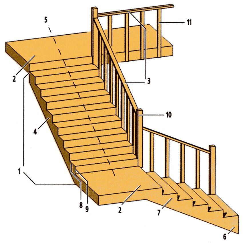 Unsur-unsur tangga: 1 - perarakan; 2 - platform; 3 - pagar; 4 - balok galas (tali atau tali busur); 5 - garisan pucuk; 6 - langkah permulaan; 7 - peringkat output; 8 - tapak; 9 - riser; 10 - alas sokongan; 11 - balusters