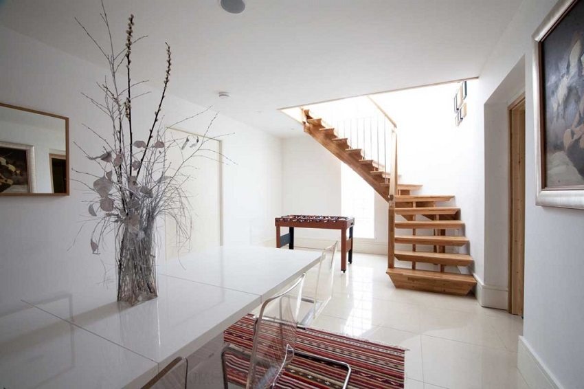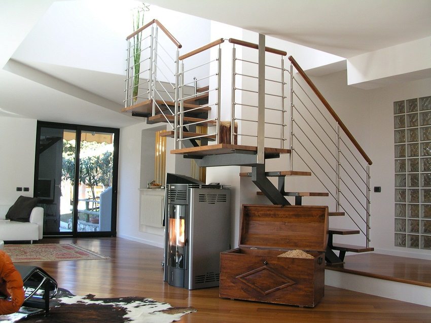 - tempat pemasangan tangga - berhampiran dinding atau di tengah-tengah bilik. Sekiranya struktur dirancang di sepanjang dinding, maka pagar pegangan tangan dan tangga boleh disusun hanya di satu sisi;
