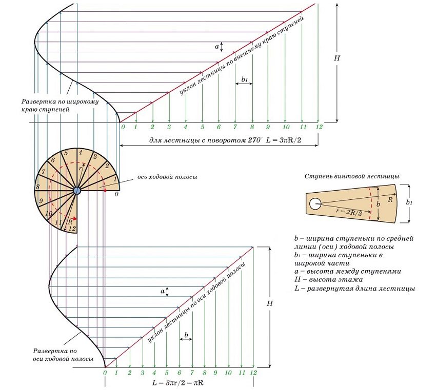 Semasa mengira tangga spiral, harus diingat bahawa jari-jari bulatan di mana ia berada akan panjang langkah. Sekiranya panjang tangga tangga spiral adalah 100 cm, maka struktur sedemikian akan mengambil kawasan 1.5 kali lebih sedikit daripada struktur gerakan lurus dengan panjang tangga yang sama.