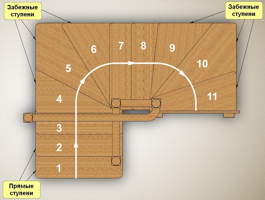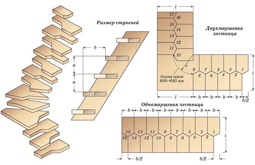 Memandangkan struktur single-march lurus untuk pemasangan memerlukan ruang yang mencukupi, struktur putar dengan platform atau tangga jejari digunakan di pondok dan pondok musim panas. Semasa mengira tangga dengan pendaratan ke lantai dua dengan putaran 180 atau 90 darjah, peranti jalur segi empat atau persegi diambil kira, dari mana putaran dibuat dengan bilangan darjah yang sesuai.