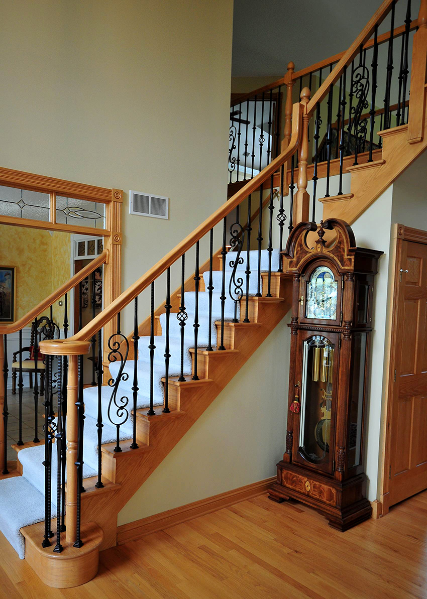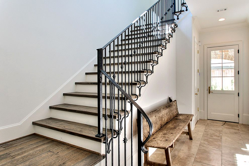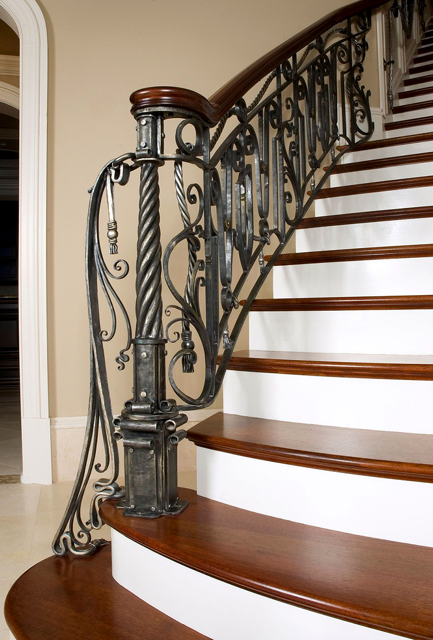 Pagar tangga besi tempa di dalam rumah dengan pengulangan berirama sering dilengkapi dengan tiang dalam bentuk tiang, yang disebut balusters. Mereka boleh mempunyai bentuk puncak. Selalunya struktur sedemikian dilengkapi dengan tiang yang diperbuat daripada batang persegi yang berpusing di sekitar paksi mereka sendiri. Elemen penempaan artistik juga terdapat dalam kes ini. Motif bunga berlaku di pagar seperti itu.