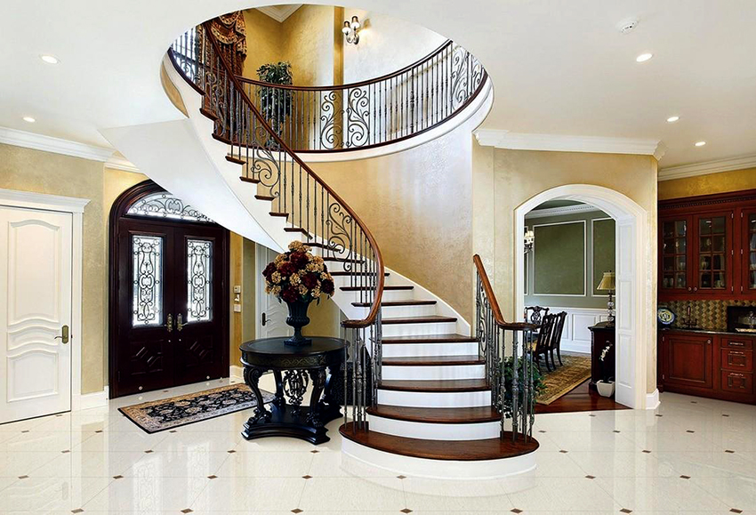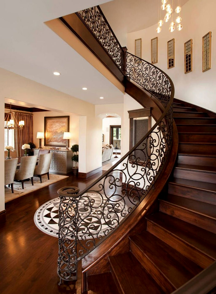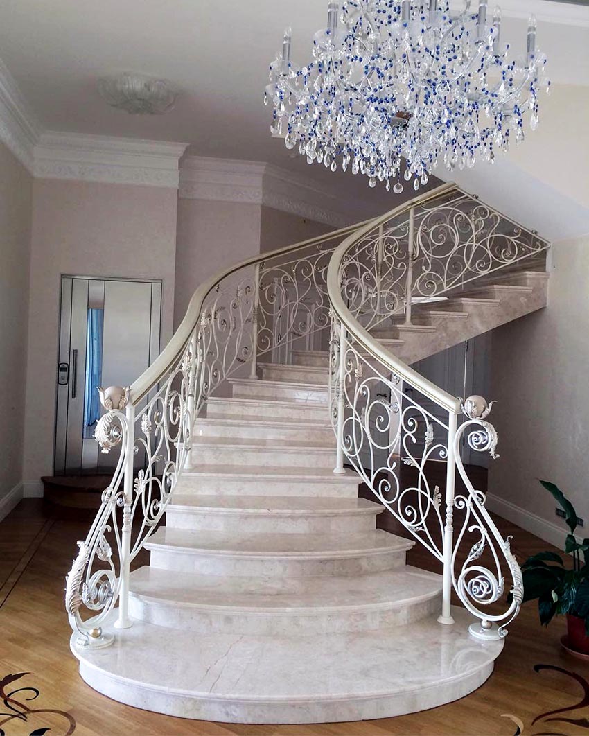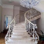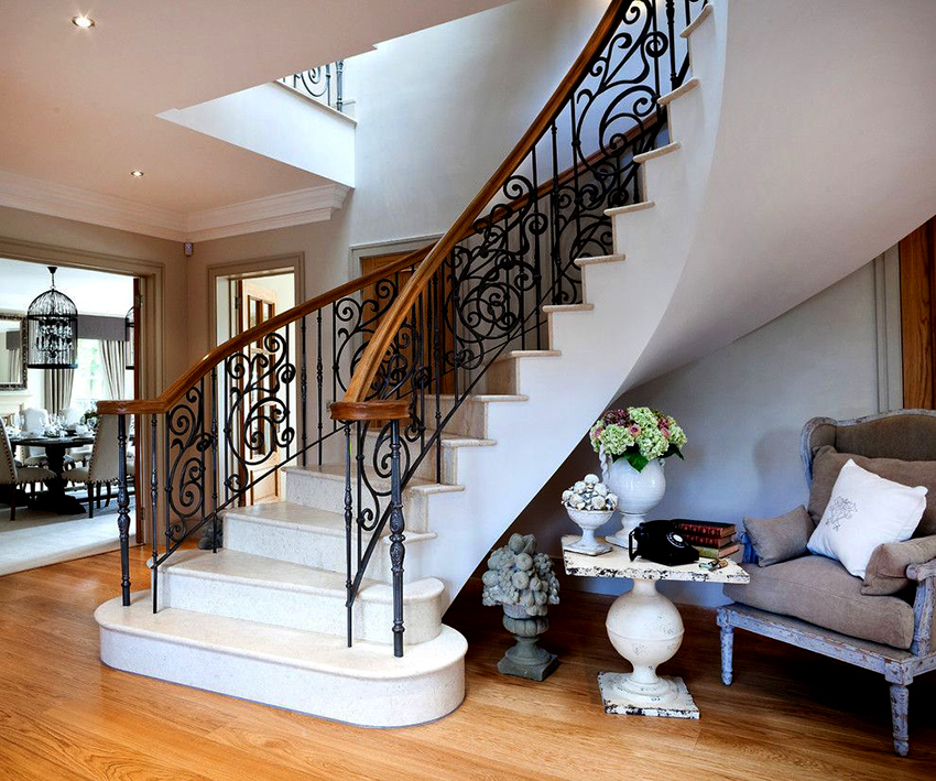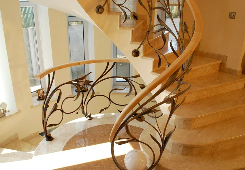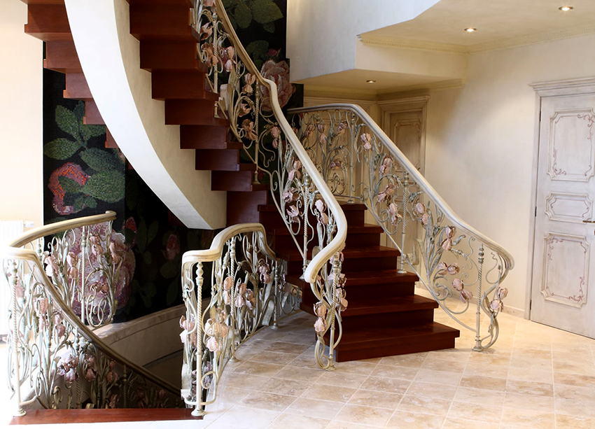 Semasa memilih pagar besi tempa untuk tangga ke rumah, anda perlu fokus pada anggaran. Reka bentuk yang mempunyai unsur penempaan artistik kelihatan paling mengagumkan. Hiasan hiasan sangat sesuai untuk dalaman separa antik.