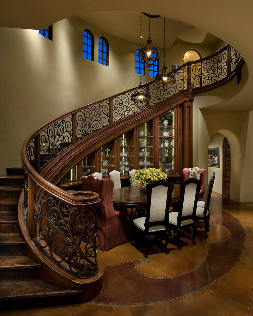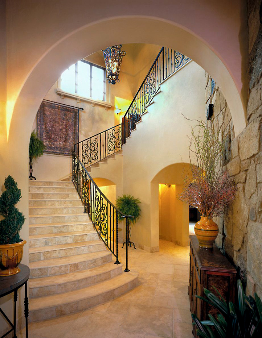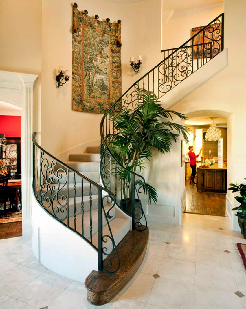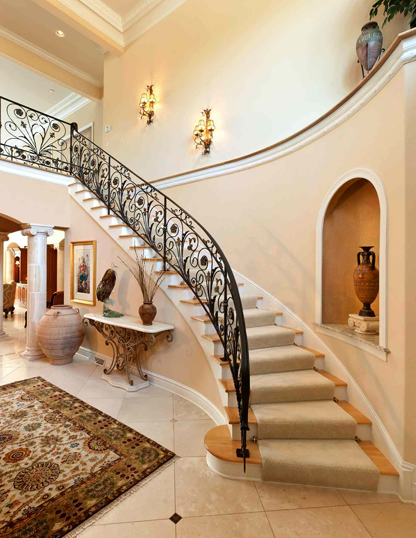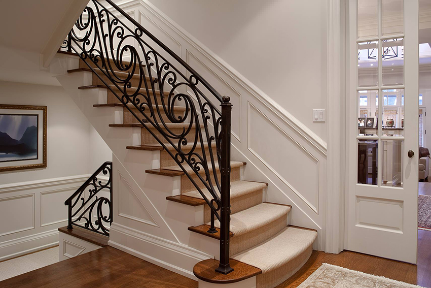 Semasa memilih pagar besi tempa untuk tangga ke rumah, anda perlu fokus pada anggaran. Reka bentuk yang mempunyai unsur penempaan artistik kelihatan paling mengagumkan. Hiasan hiasan sangat sesuai untuk dalaman separa antik.