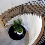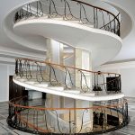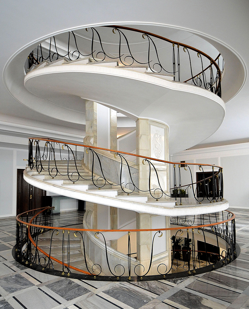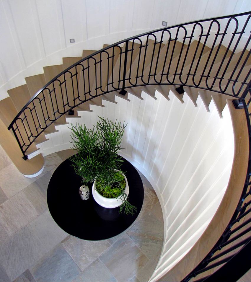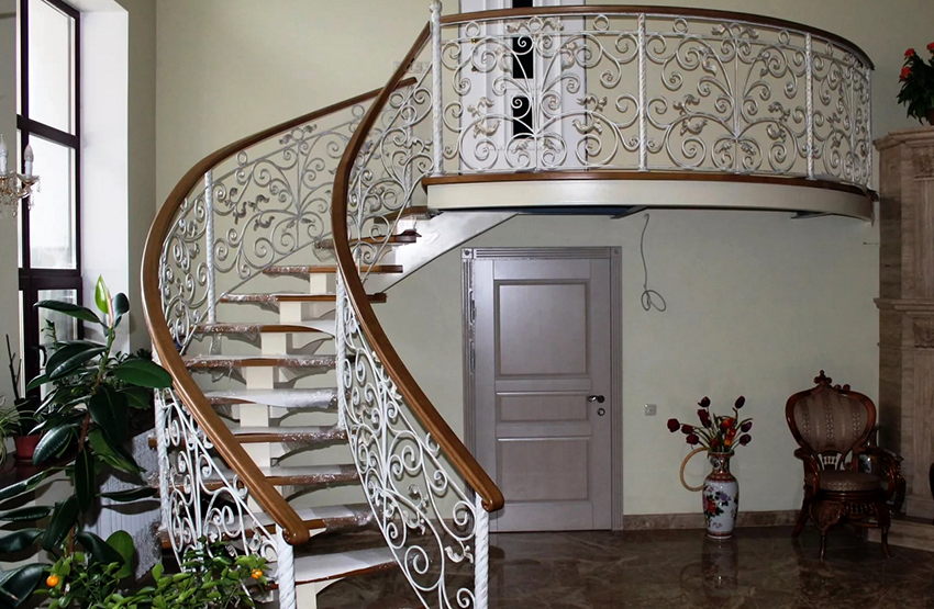 Pemasangan tangga spiral memerlukan pendekatan khas. Pagar tangga spiral palsu lebih mahal daripada pilihan standard (lurus atau serong). Untuk memperpanjang jangka hayat hiasan logam, disarankan untuk menggunakan lapisan polimer khas di atasnya.