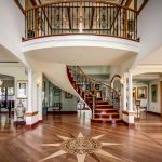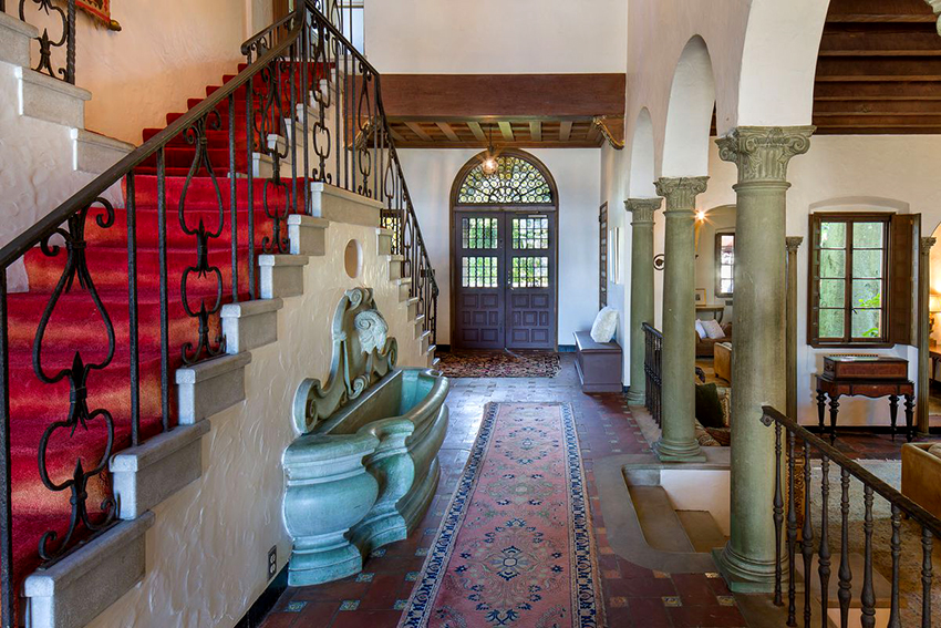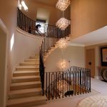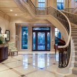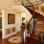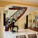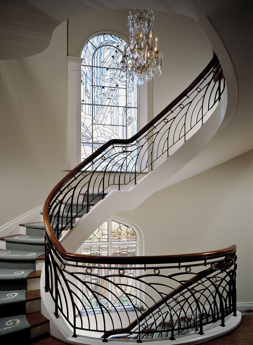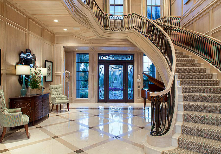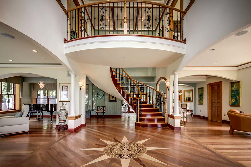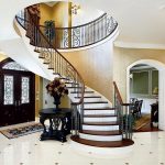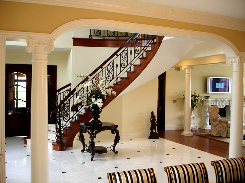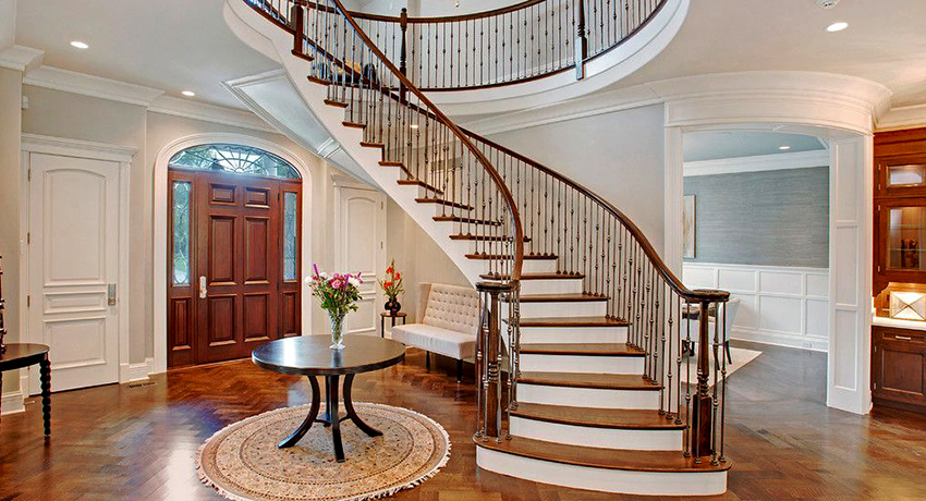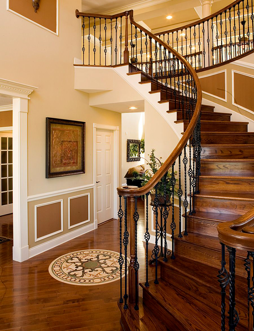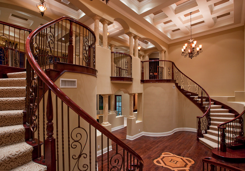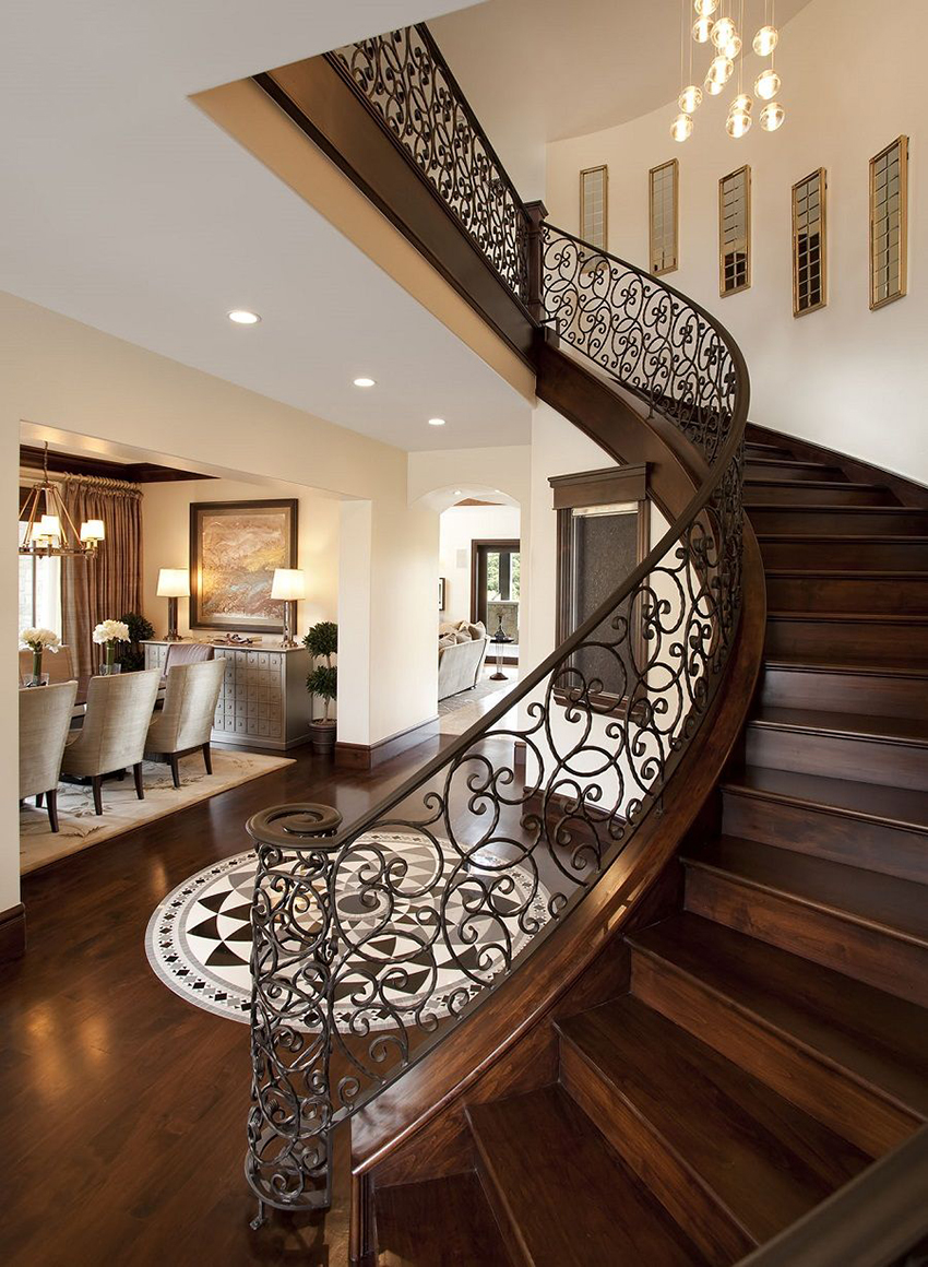 Kediaman depan yang besar, terdiri dari dua tingkat, mempunyai ruang yang cukup, jadi sangat sesuai untuk pemasangan tangga seperti itu. Penempaan dalam kes ini akan kelihatan mengagumkan tanpa keterlaluan dalaman. Penerbangan tangga boleh dibuat dalam bentuk huruf "T" atau memiliki struktur berbentuk L.