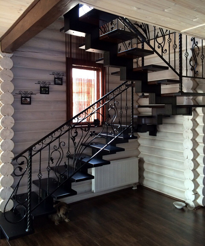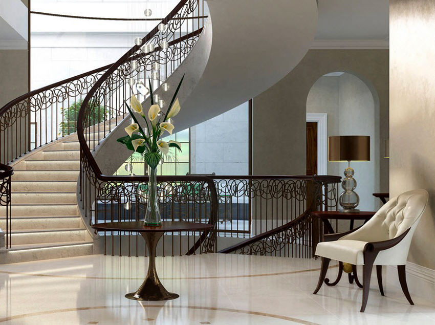 Nota! Hiasan logam mengubah dalaman, walaupun yang paling sederhana. Pegangan tangan dengan elemen penempaan dapat menghiasi tangga biasa yang terbuat dari kayu, yang membuatia lebih halus.