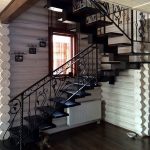 Nota! Pagar yang dilengkapi dengan elemen penempaan digabungkan sempurna dengan tangga spiral atau dua penerbangan. Skop operasi struktur sedemikian cukup luas, kerana dapat dipasang bukan hanya di bangunan kediaman, tetapi juga di tempat pejabat.