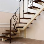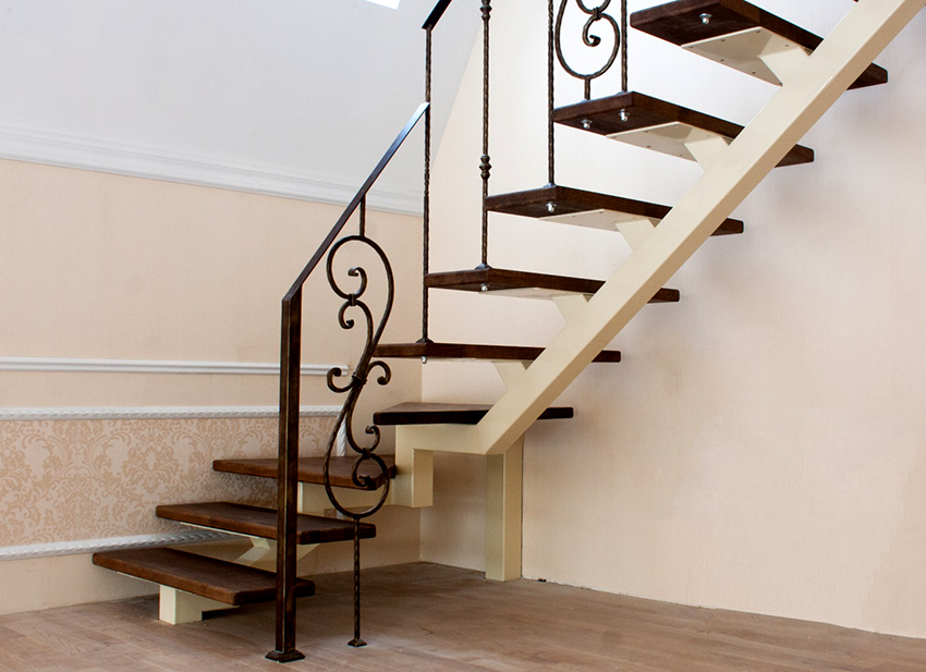 Maklumat berguna! Tangga rumah boleh bersebelahan dengan dinding. Dalam keadaan seperti itu, pagar standard dipasang di seberang, dan pegangan tangan yang dipalsukan dipasang ke dinding.