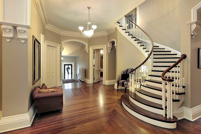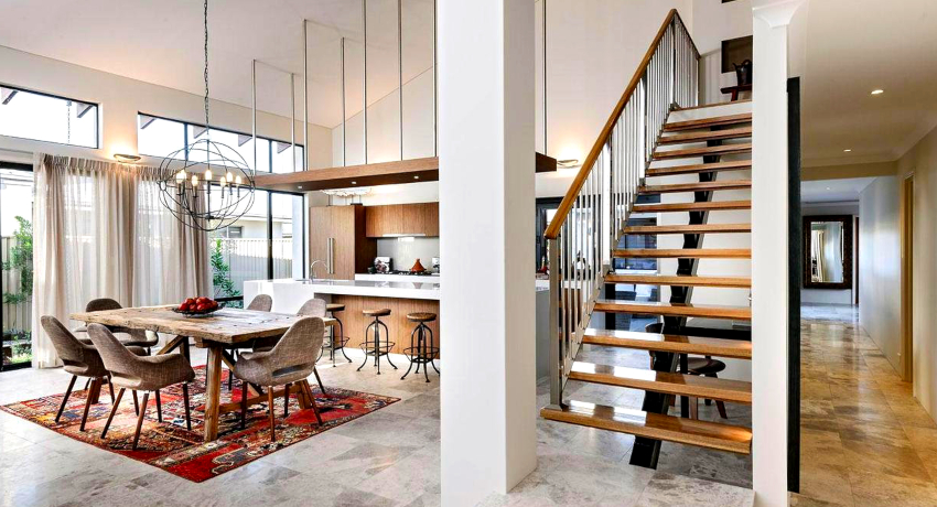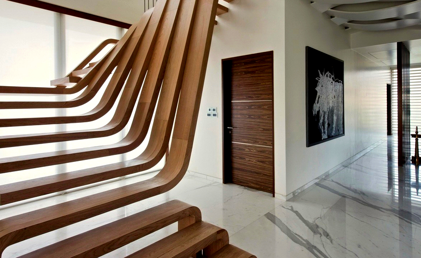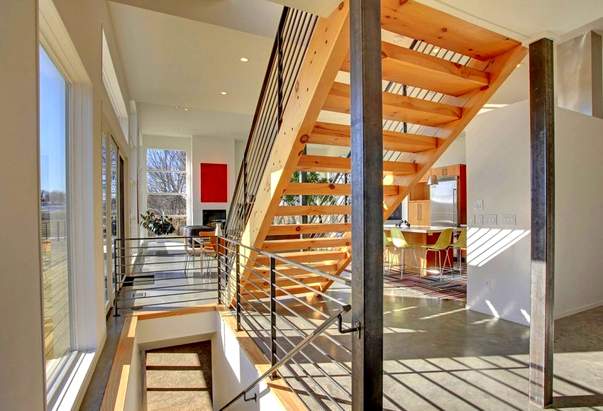 - Dalaman. Seperti namanya, struktur sedemikian terletak di dalam rumah. Dalam kebanyakan kes, tangga dalaman terbuat dari kaca atau kayu, dan naungannya dipilih bergantung pada bahagian dalamannya.