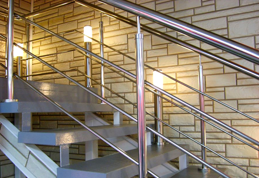 - Dinding dipasang. Pagar dan kelengkapan pencahayaan dipasang menggunakan paip alur keluli tahan karat cermin.