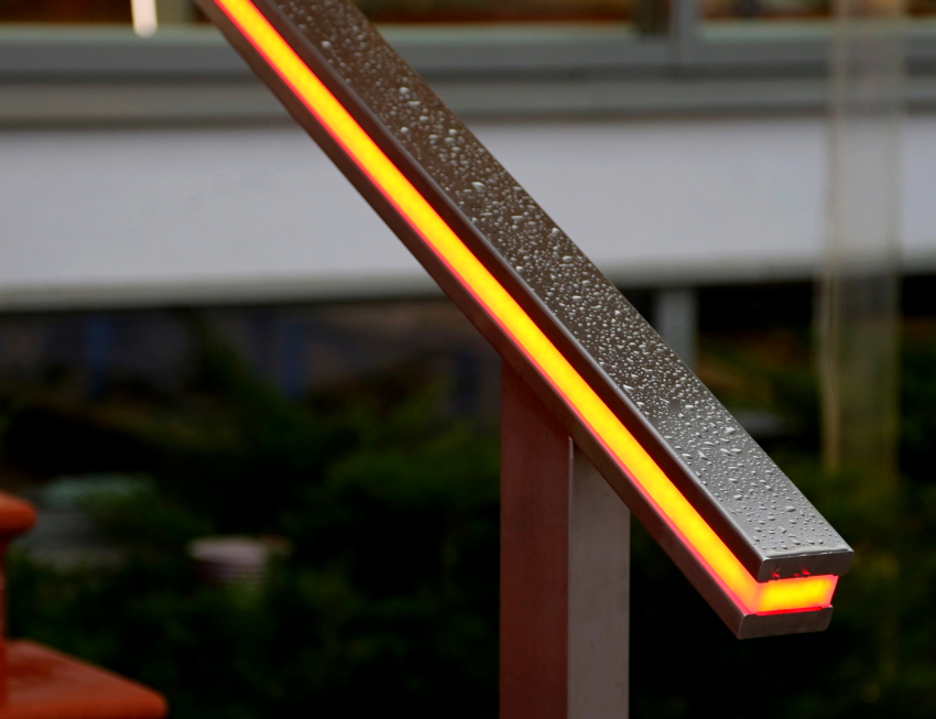 - Pagar kaca yang diterangi. Dalam kes ini, pita dioda tertanam di dalam profil utama: untuk tujuan ini, disarankan untuk memilih diod dengan kekuatan tidak lebih dari 5 W / m. Warna cahaya dipilih berdasarkan ciri reka bentuk dalaman.