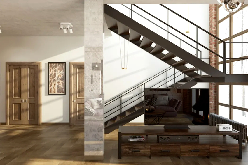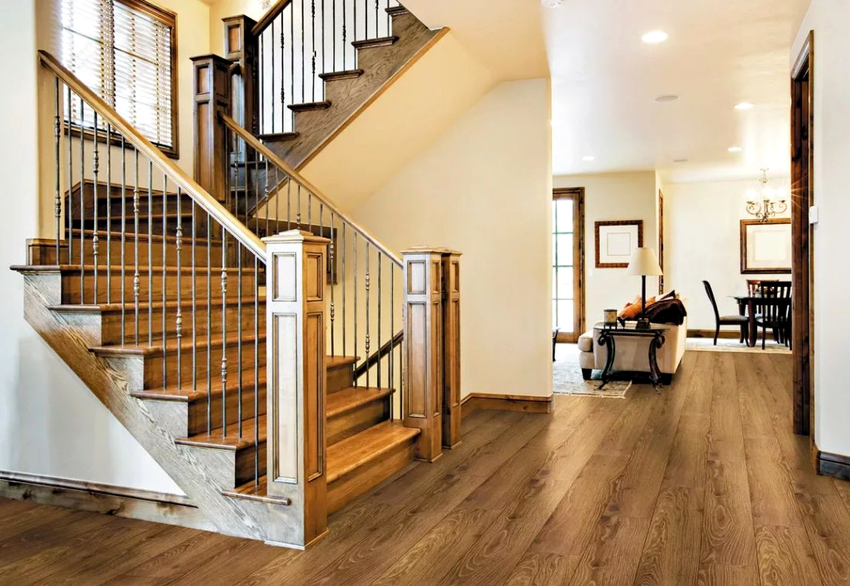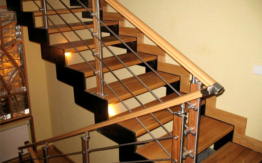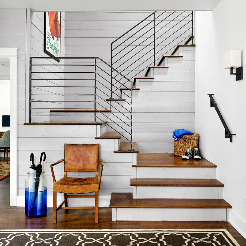 - tangga kayu dengan pagar logam akan menekankan gaya desa, pedalaman chalet atau klasik;