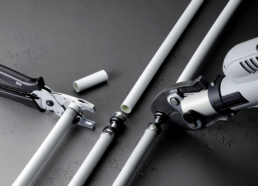 Penting! Dengan bantuan alat kelengkapan tekan, mereka membuat sambungan elemen sistem yang boleh dipercayai dan ketat, oleh itu ia disyorkan untuk digunakan semasa meletakkan air dan pemanasan di dinding bangunan.