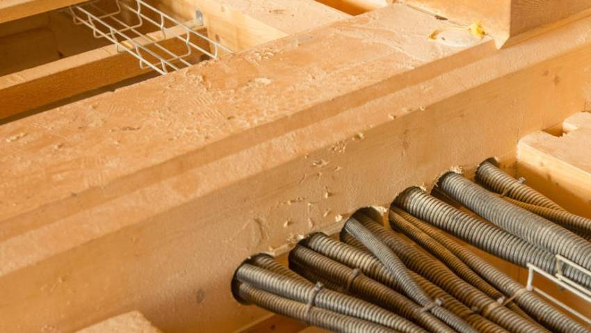 - Pemasangan di dalam siling yang terbuat dari bahan mudah terbakar (lapisan dengan kayu, papan gipsum, pelindung komposit) memerlukan penggunaan paip tahan api, lebih baik dengan impregnasi khas. Plastik yang mudah terbakar tidak boleh digunakan di persekitaran seperti itu.