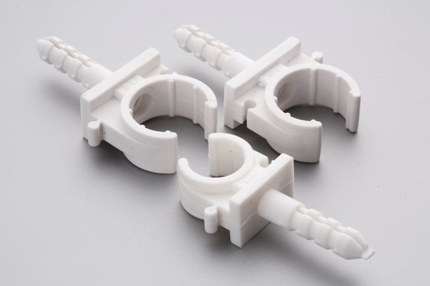 Klip khas untuk pemasangan di luar tersedia dalam format yang berbeza - dengan mengambil kira diameter paip, misalnya, klip untuk beralun 20 mm. Anda boleh menggunakan penjepit yang tersisa dari kerja pembinaan dan pemasangan, terutama untuk meletakkan ventilasi di dalam dan kotak lain ketika menggabungkan komunikasi.
