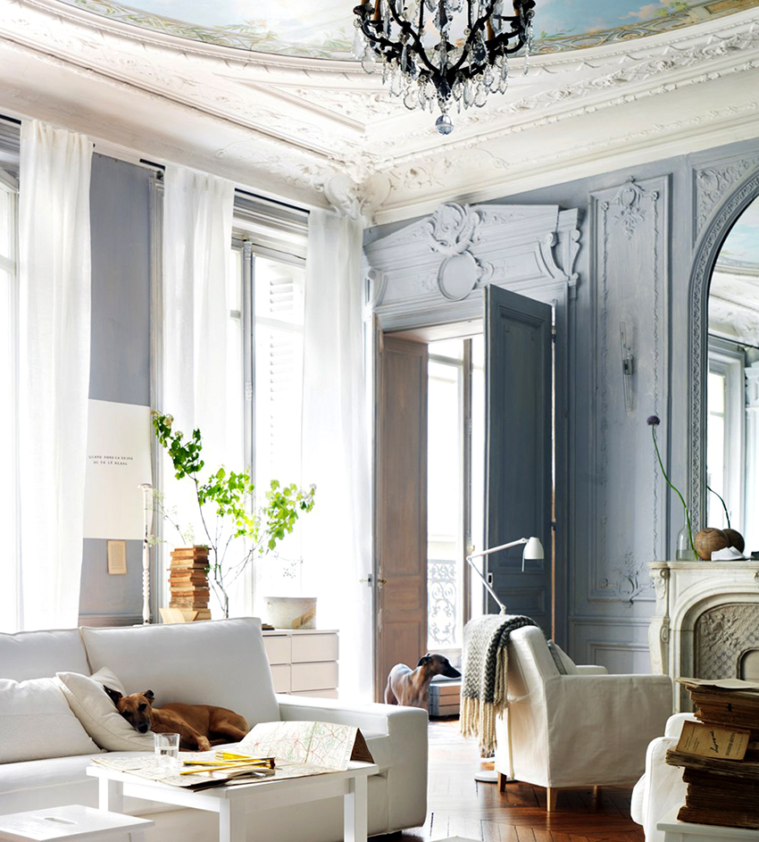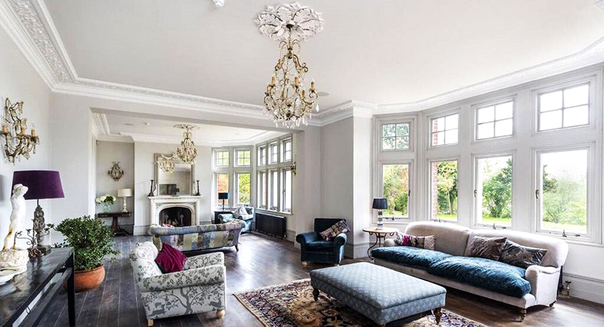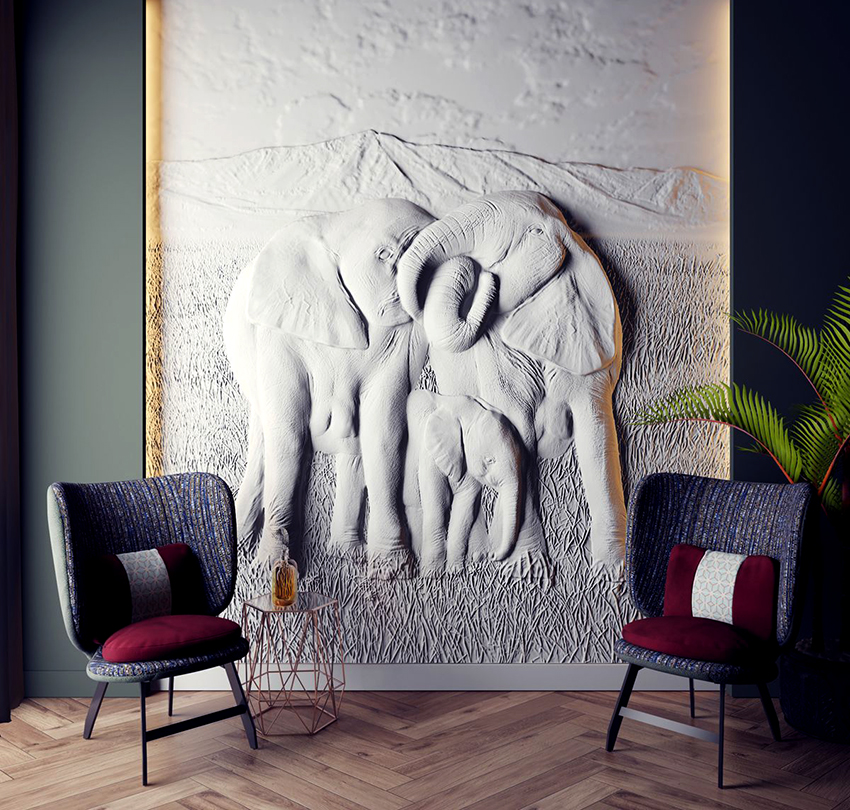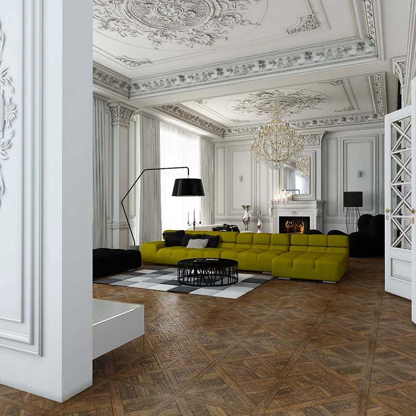 Ukiran plaster di dinding sangat sesuai untuk ruang tamu yang luas. Selain plaster untuk pemodelan yang digunakan secara tradisional untuk tujuan ini, teknologi moden juga memungkinkan untuk menggunakan campuran bangunan dengan bahan tambahan polimer (dalam kehidupan seharian - plaster akrilik).Komposisi yang lebih canggih sangat digemari - campuran gipsum, plaster akrilik dan gam PVA.