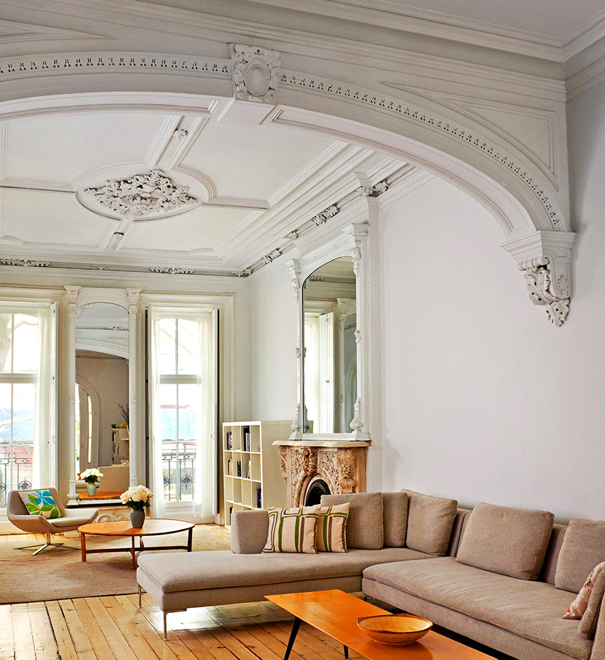 Produk gipsum tidak terbakar, tidak pecah dari panas dan sejuk, bebas menyerap dan melepaskan kelembapan, berfungsi selama berabad-abad, dan mudah dipulihkan sekiranya berlaku kerosakan. Dengan kualiti ini, anda juga boleh menggunakan hiasan acuan plaster untuk hiasan bukan sahaja di dalam rumah, tetapi juga di permukaan fasad.