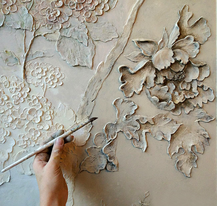 Semasa membuat relief dengan elemen tanaman dari cabang, bergantung pada ketebalannya, adalah lebih mudah untuk membuangnya dengan alat gula-gula atau jarum suntik perubatan. Ketebalan, pada gilirannya, dikendalikan oleh tekanan yang dikenakan pada pelocok jarum suntik. Tekstur diaplikasikan dengan sikat, dan patah dibentuk menggunakan pisau palet. Juga, cabang boleh dibuat dari benang yang direndam dalam larutan kerja tebal dan kemudian dikeringkan di permukaan kerja. Produk siap kemudian dilekatkan pada dinding sokongan.