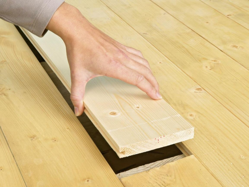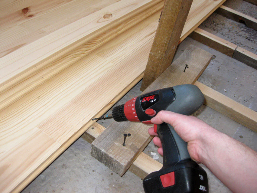 Nasihat berguna! Untuk pemasangan papan ke lantai yang lebih dipercayai, mereka boleh diikat dengan skru mengetuk sendiri. Tudung tersebut kemudian ditutup dengan sealant dan, seperti permukaan yang lain, dipernis.