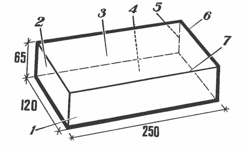 Ukuran bata kapur pasir standard dan nama sisinya: 1 - sudu, 2 - poket, 3 - katil atas, 4 - katil bawah, 5 - tulang rusuk menegak, 6 - tulang rusuk melintang mendatar, 7 - tulang rusuk membujur mendatar